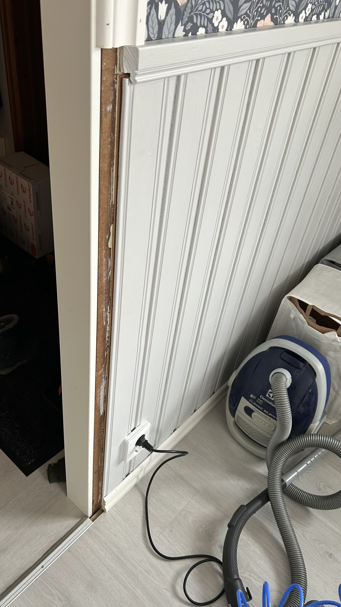 Har idag en glipa på cirka 40mm där det saknas foder mot bröstpanelen från den borttagna dörrkarmen.