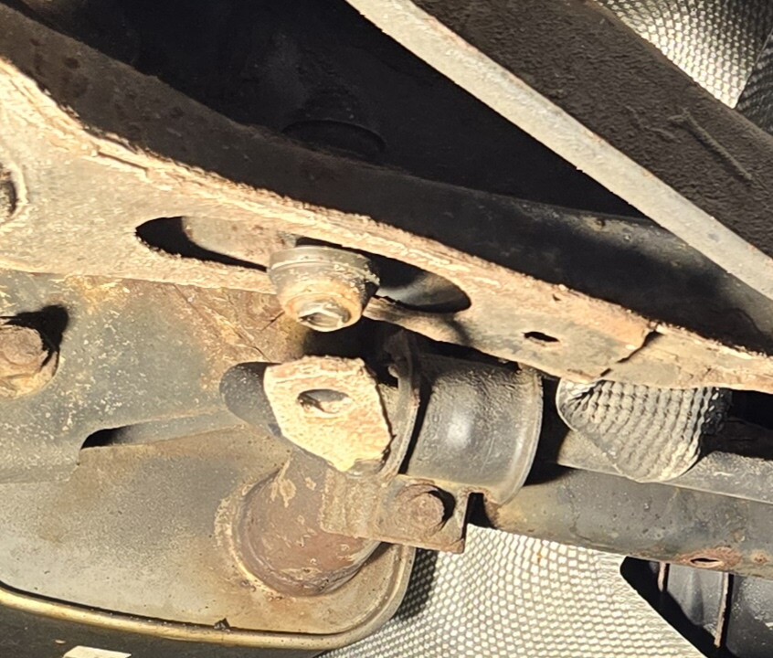 Böjde ner krängningshämmaren så att jag kom åt att slå till med hammaren å sedan i med de nya skruvarna å bussningarna.