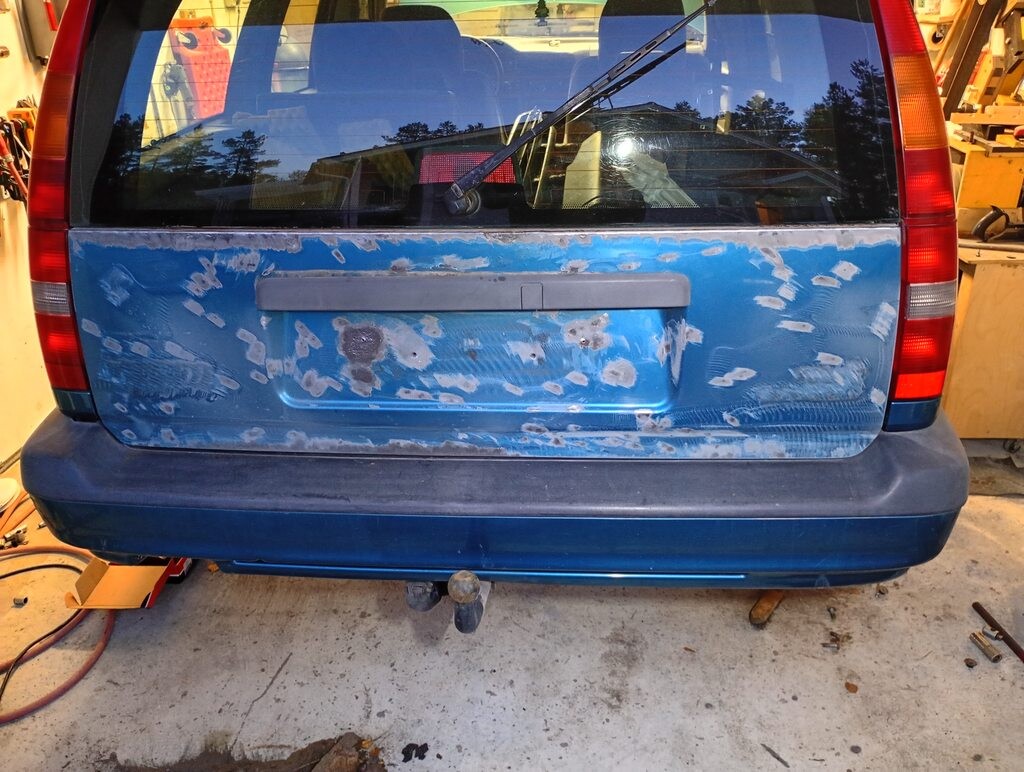 Börjat gå igenom bakluckan, har den och andra små fläckar också som ska fixas men bakluckan är värst. Vinkelslip med roterande stålborste, tog bort emblemen med tandtråd först. Mycket jobb kvar med att få så mycket rost som möjligt. Sen blir det sanda hela ytan med P80 och grunda med epoxi. Då kan spackeljobbet börja.
