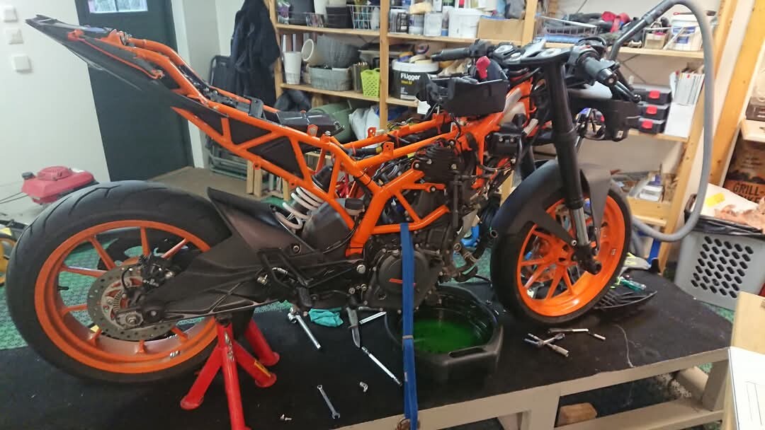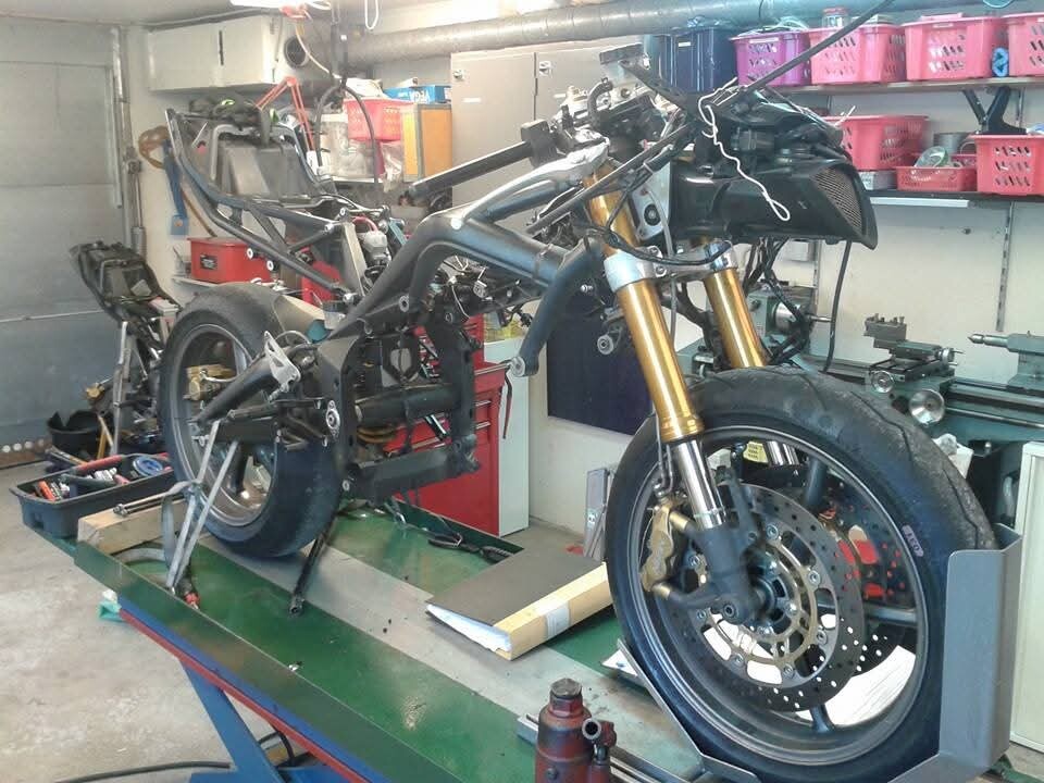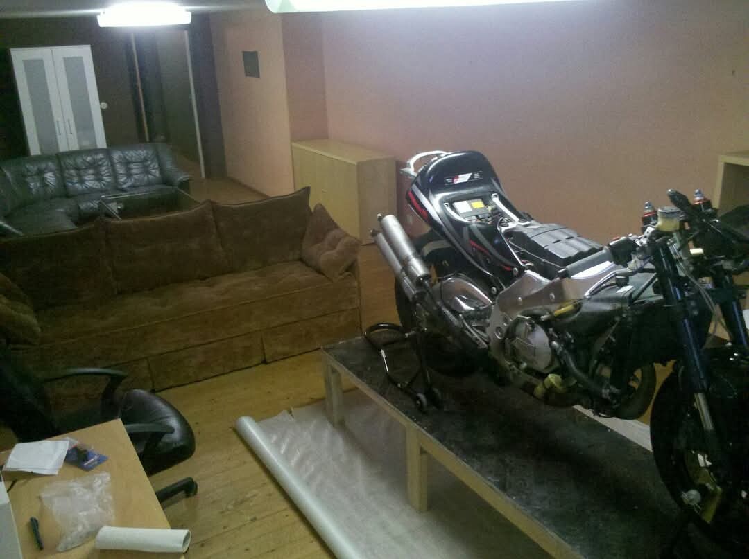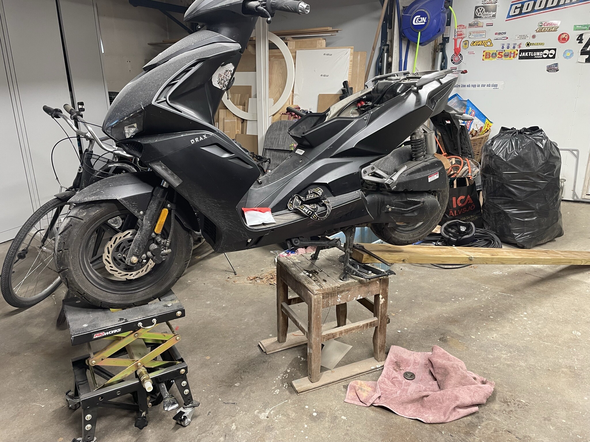 Mopederna har jag kört på fattigmans fasta bord, men även med en stabilare konstruktion än detta så skulle det ju ta emot lite att vingla upp adventuremaskinen på det till vardags. Den är tung att bara baxa runt på golvet....