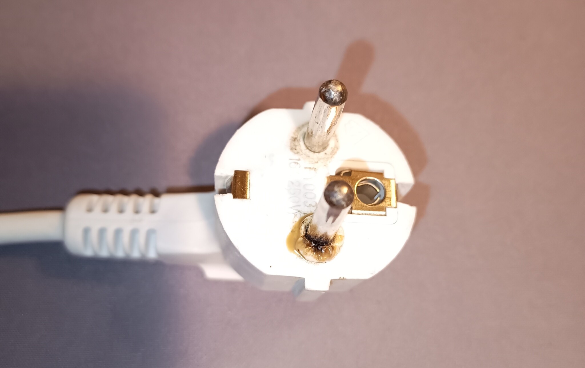Det är också på sin plats att påpeka att de pågjutna stickpropparna är klent dimensionerade och av dålig kvalitet. Här en stickpropp som överhettats till följd av glappkontakt. Finns betydande brandfara med dessa om de används oförsiktigt, i mitt fall var ett betonggolv underlaget så ingen allvarlig risk men ändå värt att varna för.