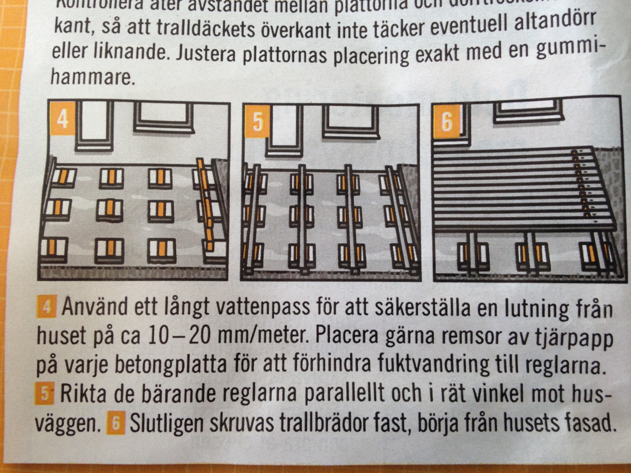 Fick ett reklamblad från Hornbach och på deras ritning verkar reglarna ligga helt löst ovanpå bentongplattorna - kanske är en okej lösning? Totalt handlar det om 28 bjälkar, så det kanske blir onödigt dyrt att sätta betongplattor under varje bjälke? Hur skulle ni gjort i min situation?