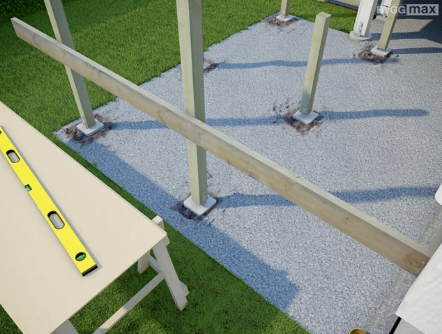 1) montera stolpar i stolpskor/plint och sen montera bärlina på stolpar.