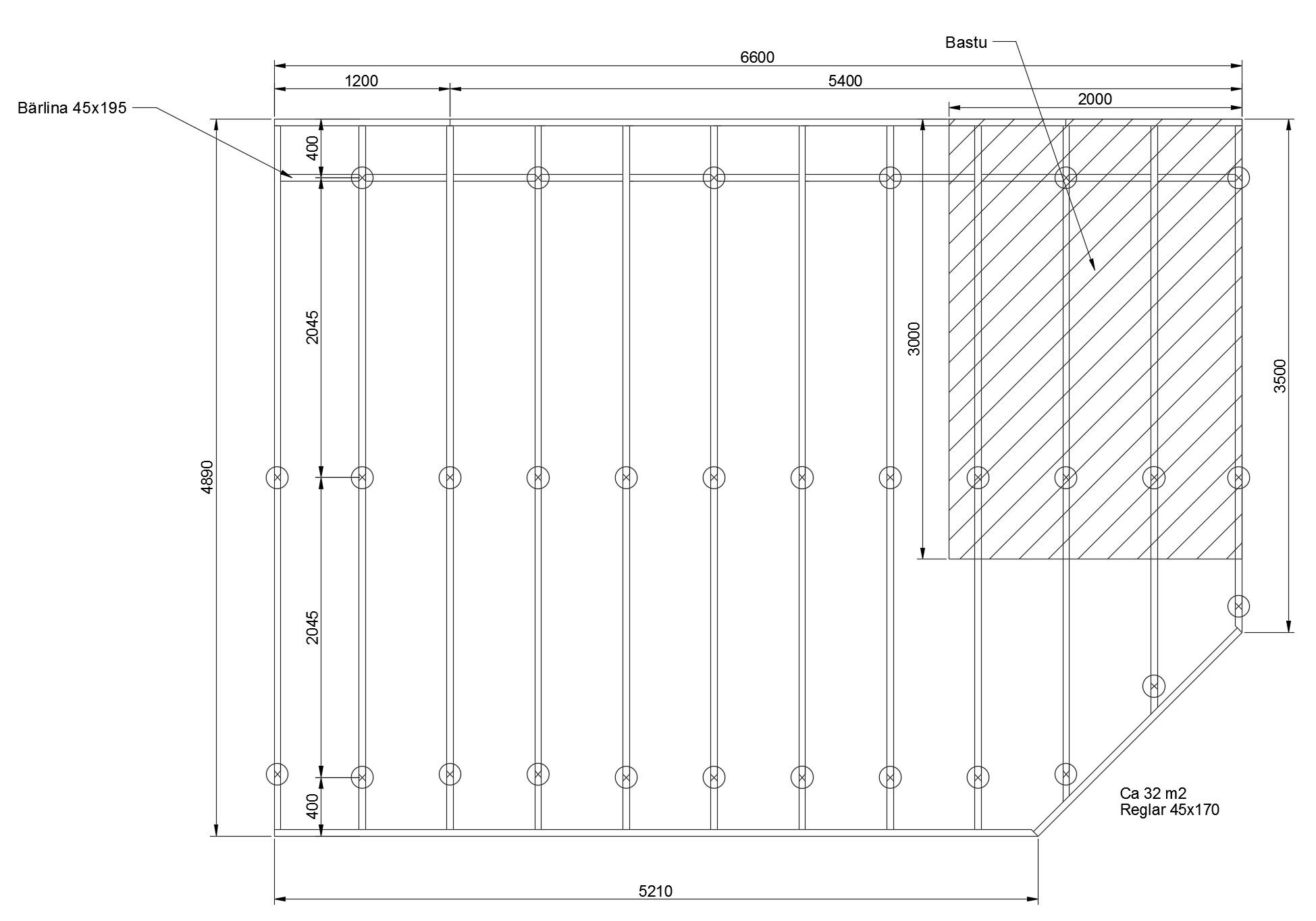 Jag kommer att sätta en bärlina på 45x195, som kommer att stå på plintar med stolphållare ner mot berget som ligger runt 40 till 100 cm ner. Här kommer jag att borra ner stolphållaren i berget och använda kemankare.