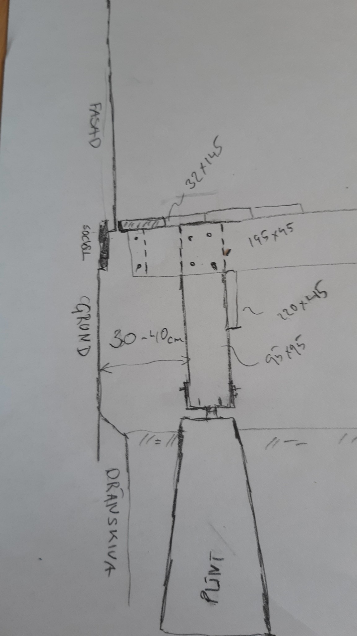 Har börjat planera nästa års altanbygge. Vi kommer att bygga en altan på plintar och tanken är att inte skruva bärlinan i fasaden. Min fundering är hur jag ska utforma altan inkl bärlina in mot fasaden. Jag har skissat en ide som jag gärna vill få feedback på. OBS den är inte skal enlig.