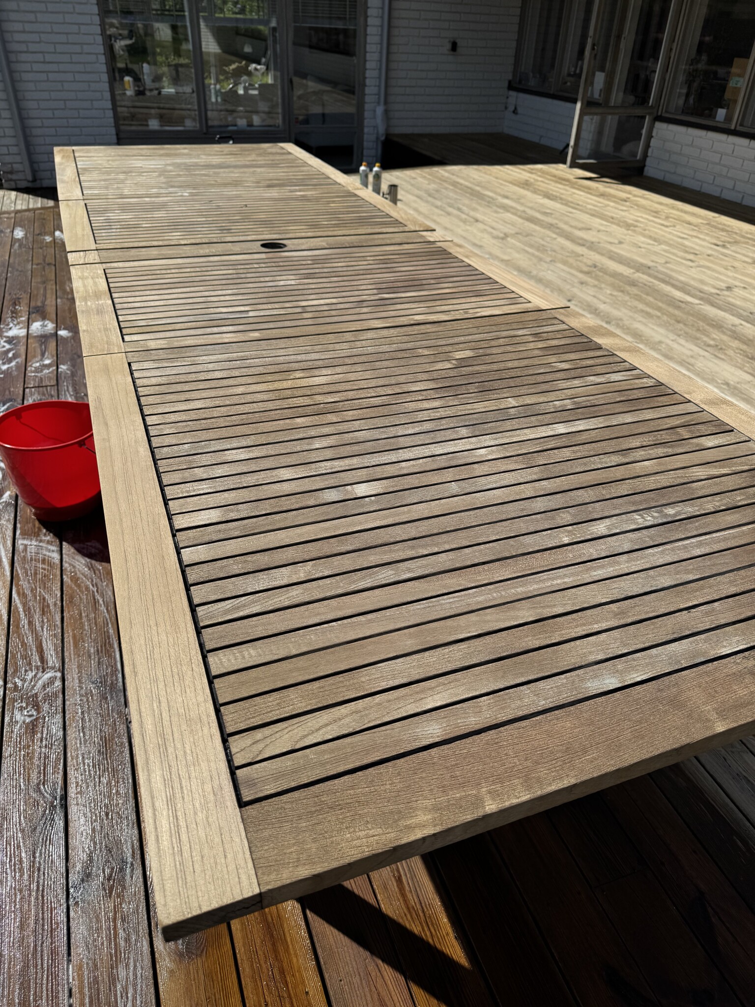 Bordsskiva i teak efter rengöring med maskinen och tralltvätt.