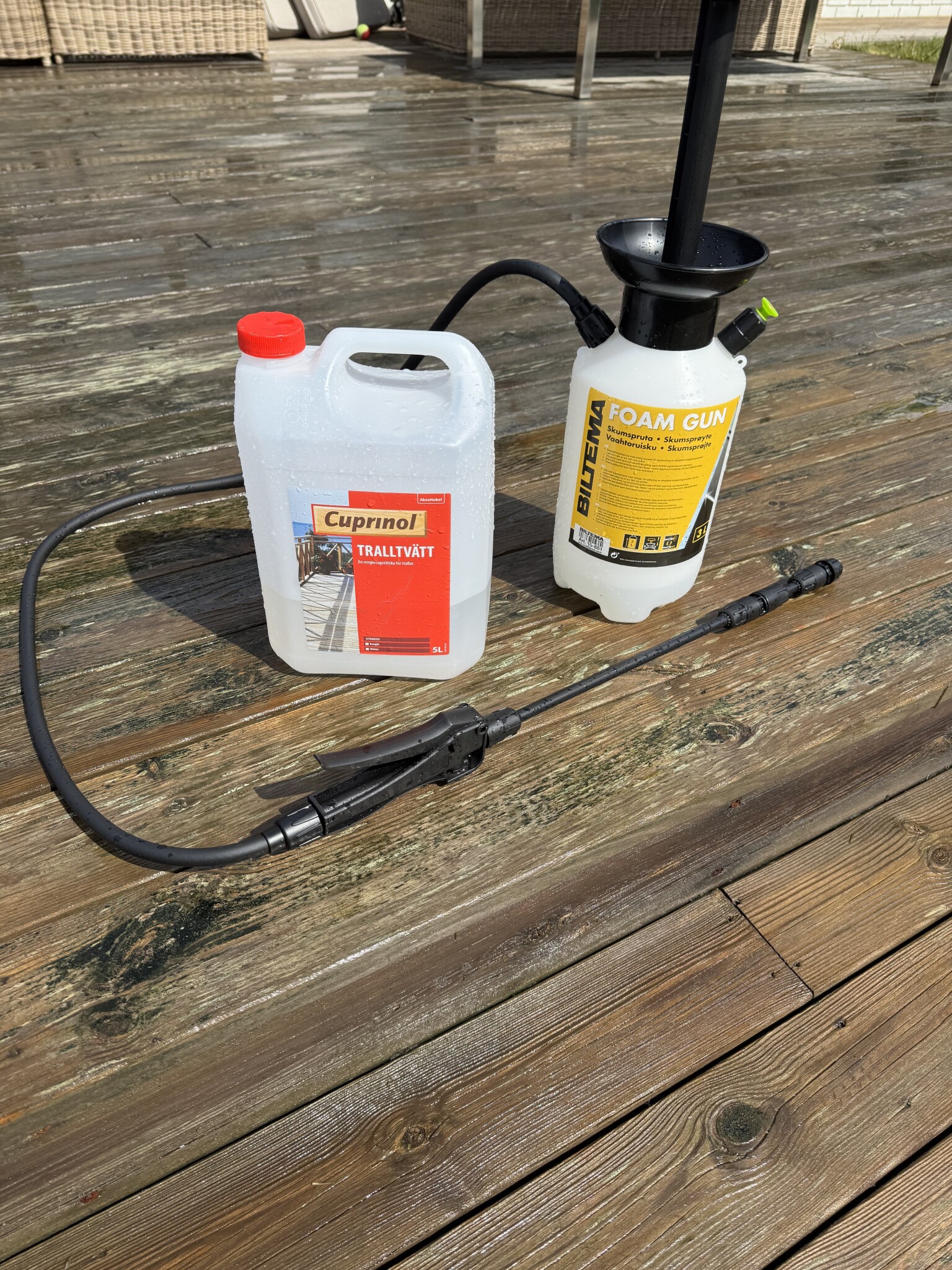 Först vattnade jag den yta jag skulle göra rent. I mitt fall 4-5 plankor på ca 10 meter åt gången. Sprejade sedan koncentrerad Cuprinol Tralltvätt med en tryckspruta på den blöta ytan. Jag använde en skumspruta med handpump från Biltema som fungerade perfekt. Låt Cuprinolen verka 10-15 minuter. Vattna försiktigt med fin stråle efter halva tiden så att ytan som ska tvättas hela tiden hålls blöt. Det gick åt ca 15 liter koncentrerad Cuprinol på min altan som är 70-80 kvm.