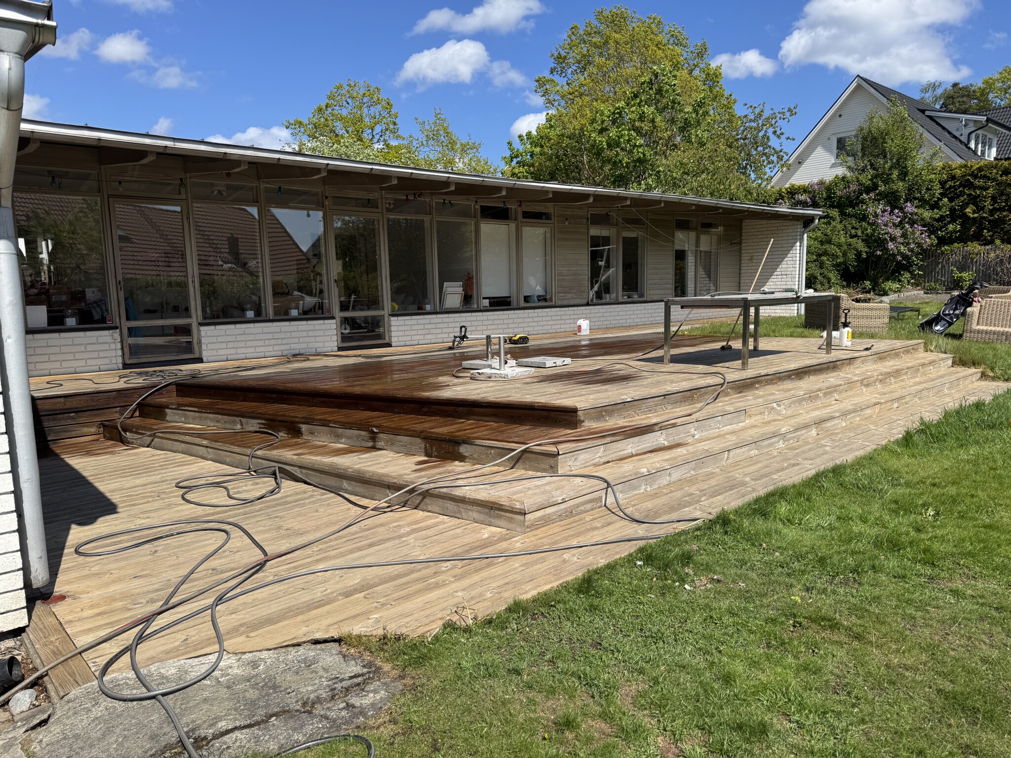 När man är klar med maskinen spolar man av ordentligt med vattenslang. Spola även fasad och annat som blivit geggigt av allt stänk.