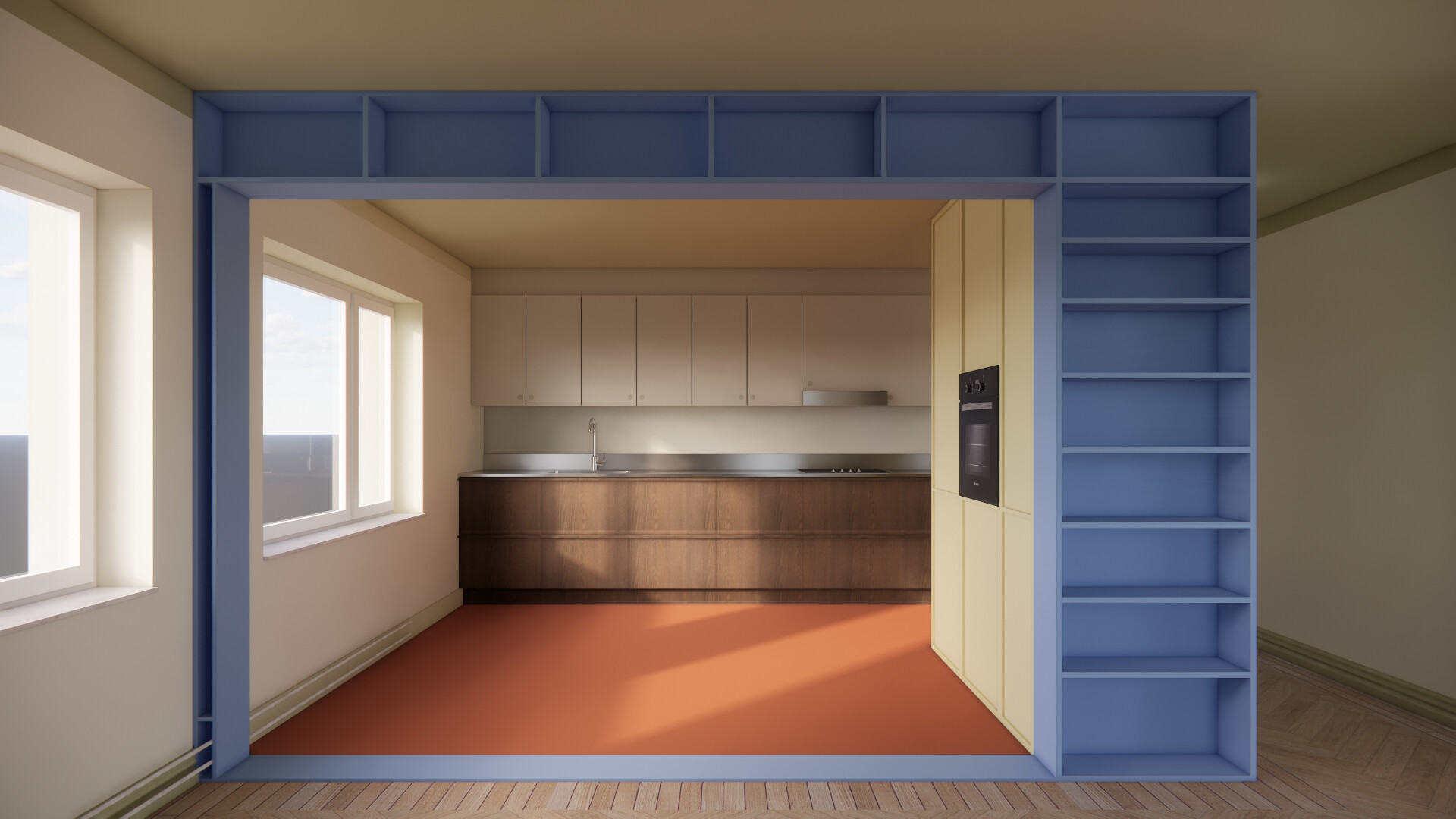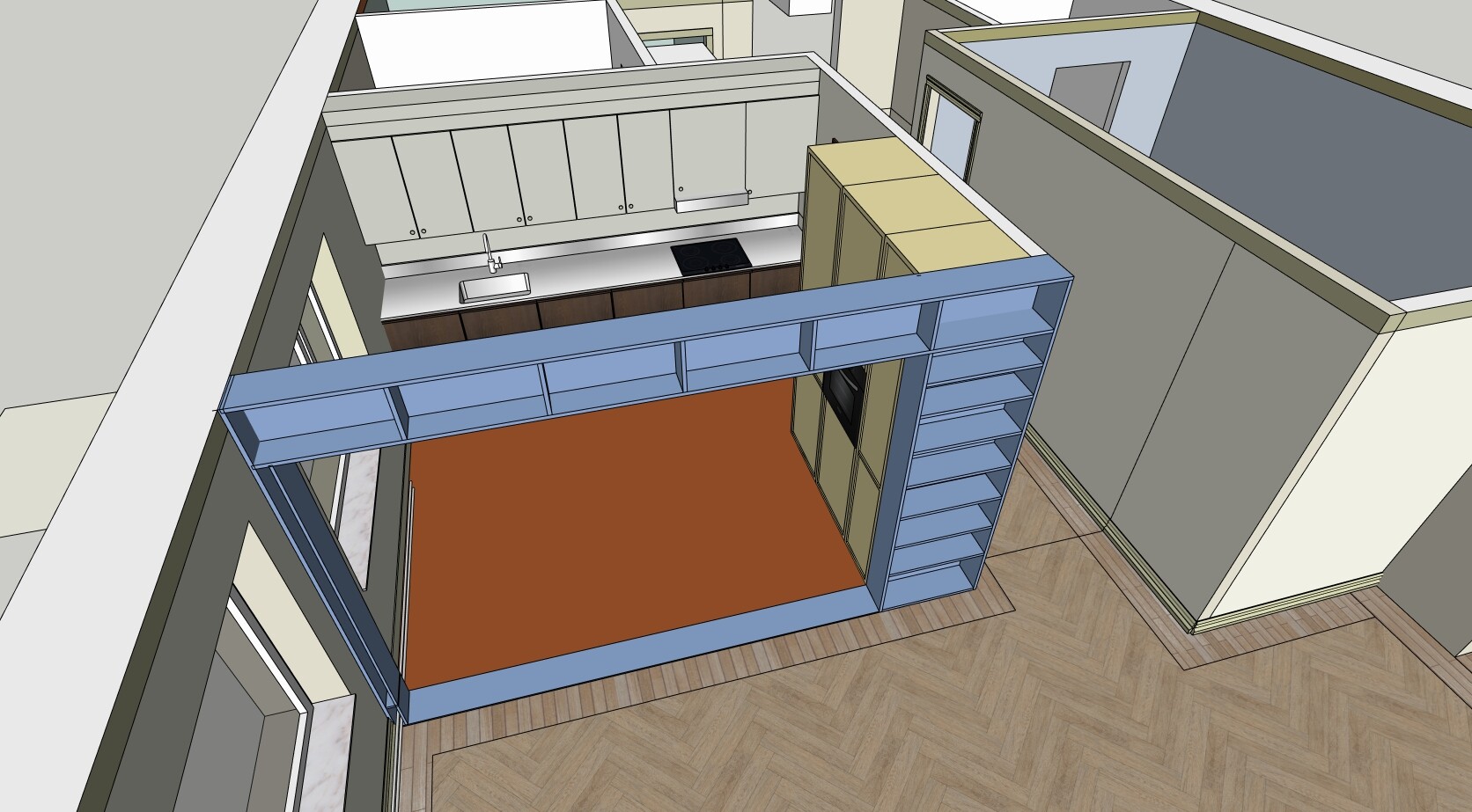 Vi renoverar köket och slår ut en vägg mellan kök och vardagsrum. Jag har en idé om att jag vill bygga en stor platsbyggd hylla för att rama in öppningen som blir mellan rummen samt att jag tyckte det va ett lite smart sätt att hantera skarvarna i tak och golv som blir där väggen stått.