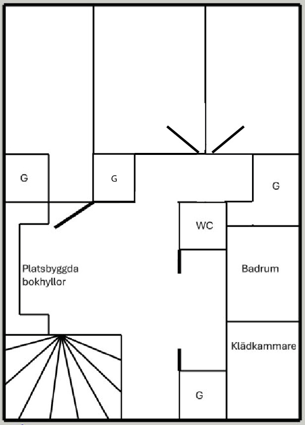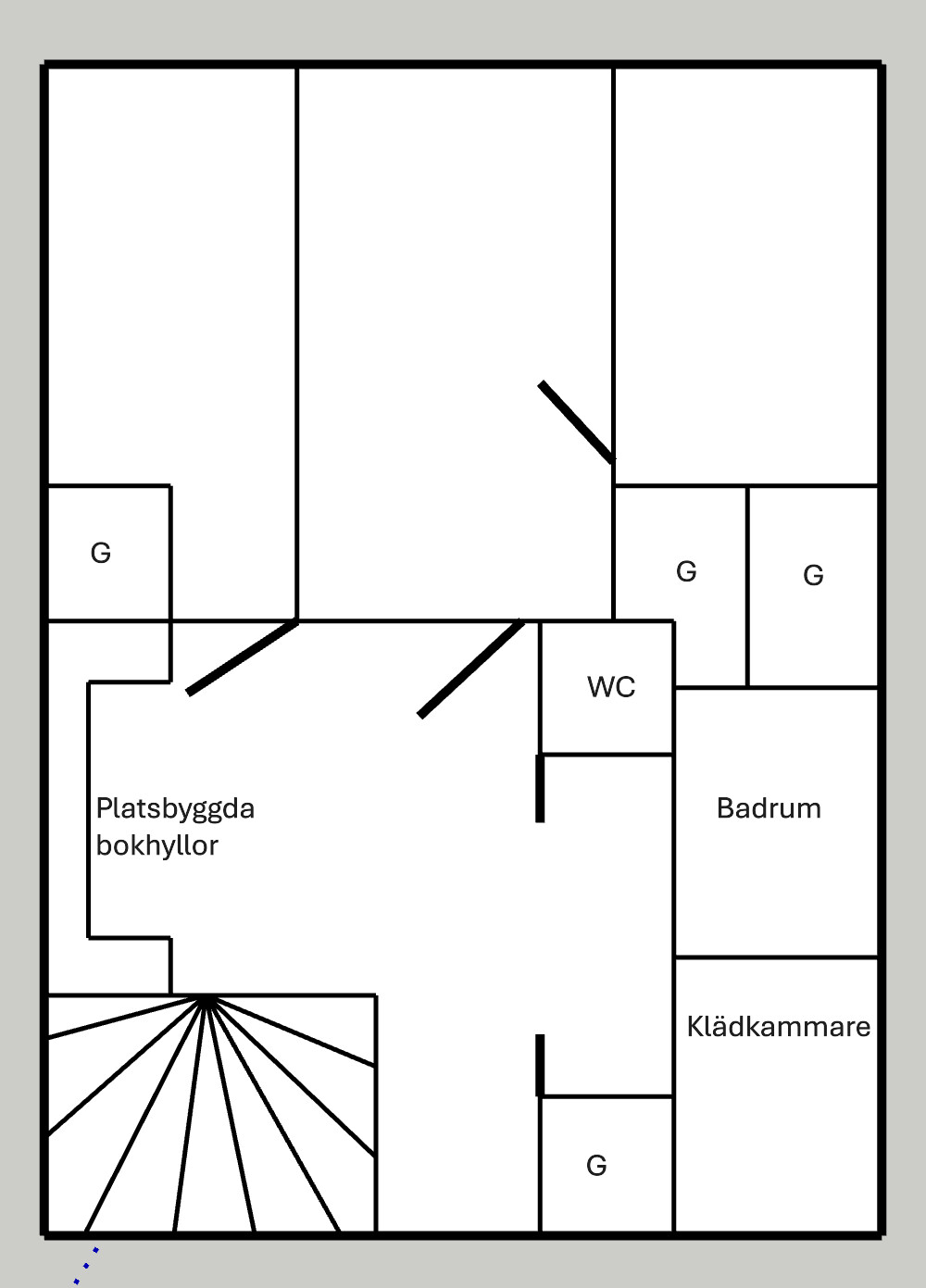 Beroende på hur fönster och takhöjd ser ut kan man kanske göra ett sovrum i nedre högra hörnet där klädkammaren är, bort till trappan.