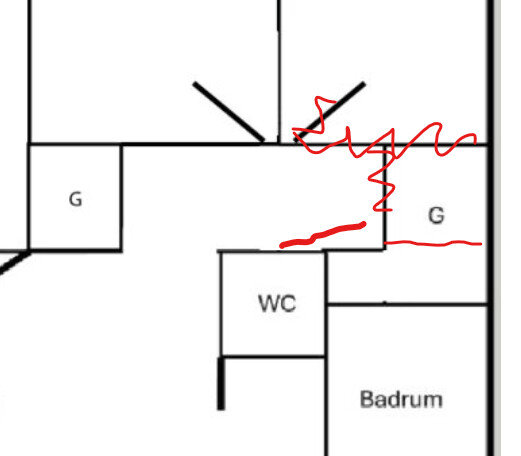 Nu vet inte ni detaljerna, men det här skulle kunna vara ett riktigt toppenförslag utifrån hur det ser ut idag. Garderobsdörren som sitter idag är placerad precis där du ritat in den röda nya dörren och är fullstor som en vanlig innerdörr. Skulle egentligen "bara" krävas en ny innervägg, flytt av den ena dörren till nya väggen och ta bort lite garderobsvägg så skulle detta vara helt genomförbart och sovrummen skulle bli ungefär lika stora.R Räknenisse skrev: