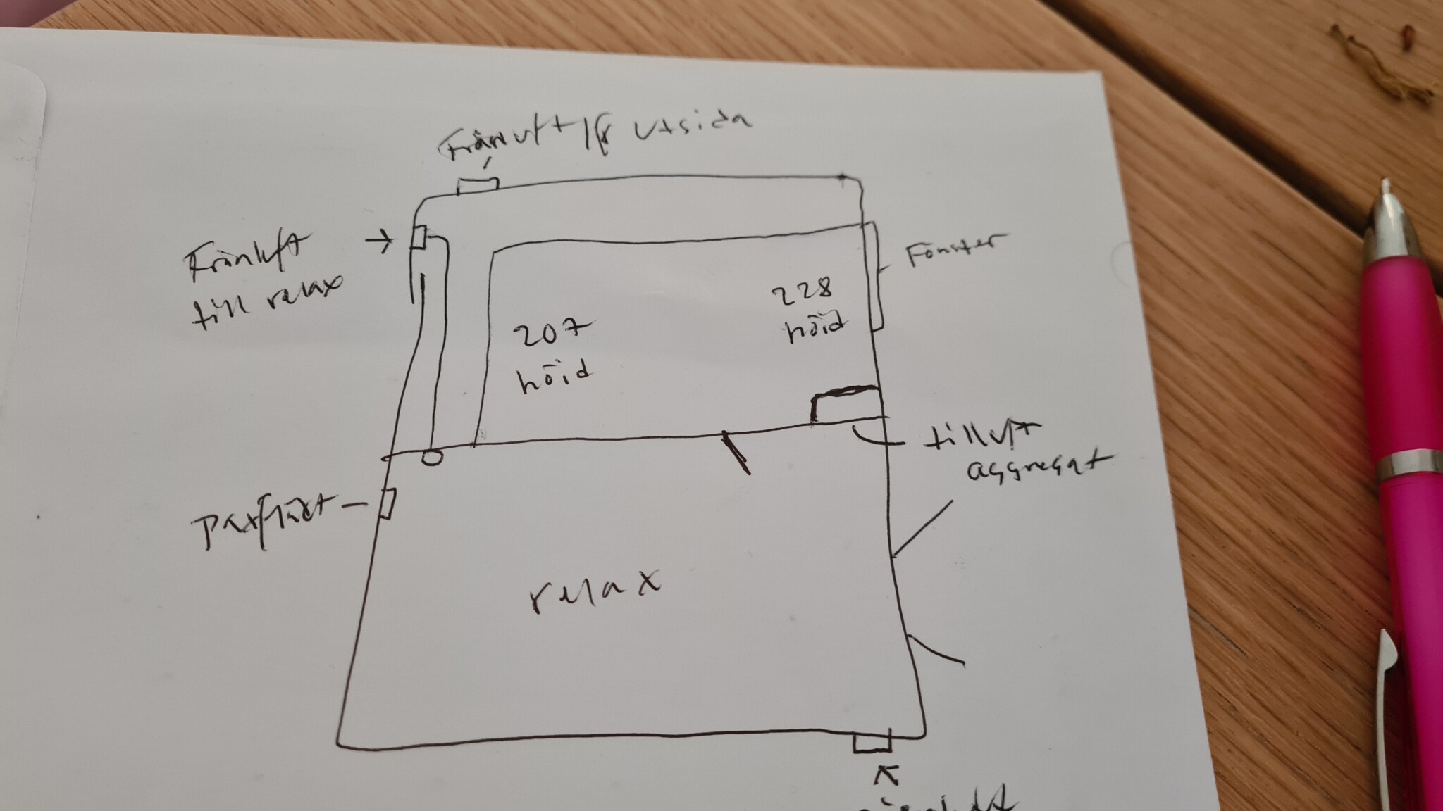 jag har tänkt såhär: Friskluftsventil på kortsida i relax del bredvid entredörr, tilluft från relax under aggregat (tylö) och frånluft i bastu diagonalt som leds tillbaka ut i relax del. Bredvid frånluftsventilen från bastun(som sitter placerad i mellanvägg bastu/relaxdel) tänker jag att jag sätter en separat temperatur/fukstyrd fläkt som leder ut luft ut från relaxdelen .min förhoppning är att den drar runt luft när bastu inte används men också drar ut den fuktiga luften under tiden bastun används.
