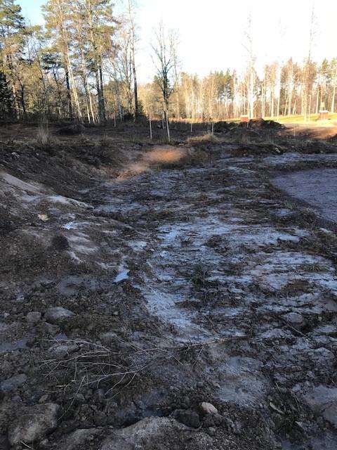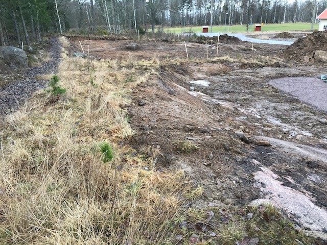 Från nedre plan är det två meter upp till högsta delen på berget och det är ungefär en meter på den andra sidan. Där vi lagt grus kommer det att bli trall. Pinnarna som sticker upp är granntomtens garage så ungefär dit sträcker sig vår tomt minus två meter.