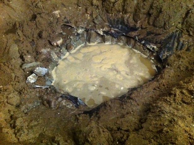 När jag grävde gropen gick jag först igenom ca 40cm sand. Därunder låg en plastfolie (kan ses på fotot) innan jag kom ner till lerjord. Denna plastfolie förvånade mig och jag undrar vad tanken med den var? Troligen att hindra att vatten tränger upp, men då grundvattennivån nu står över filmen verkar det väl optimistiskt. Tror snarare att filmen idag hindrar vatten att rinna undan.