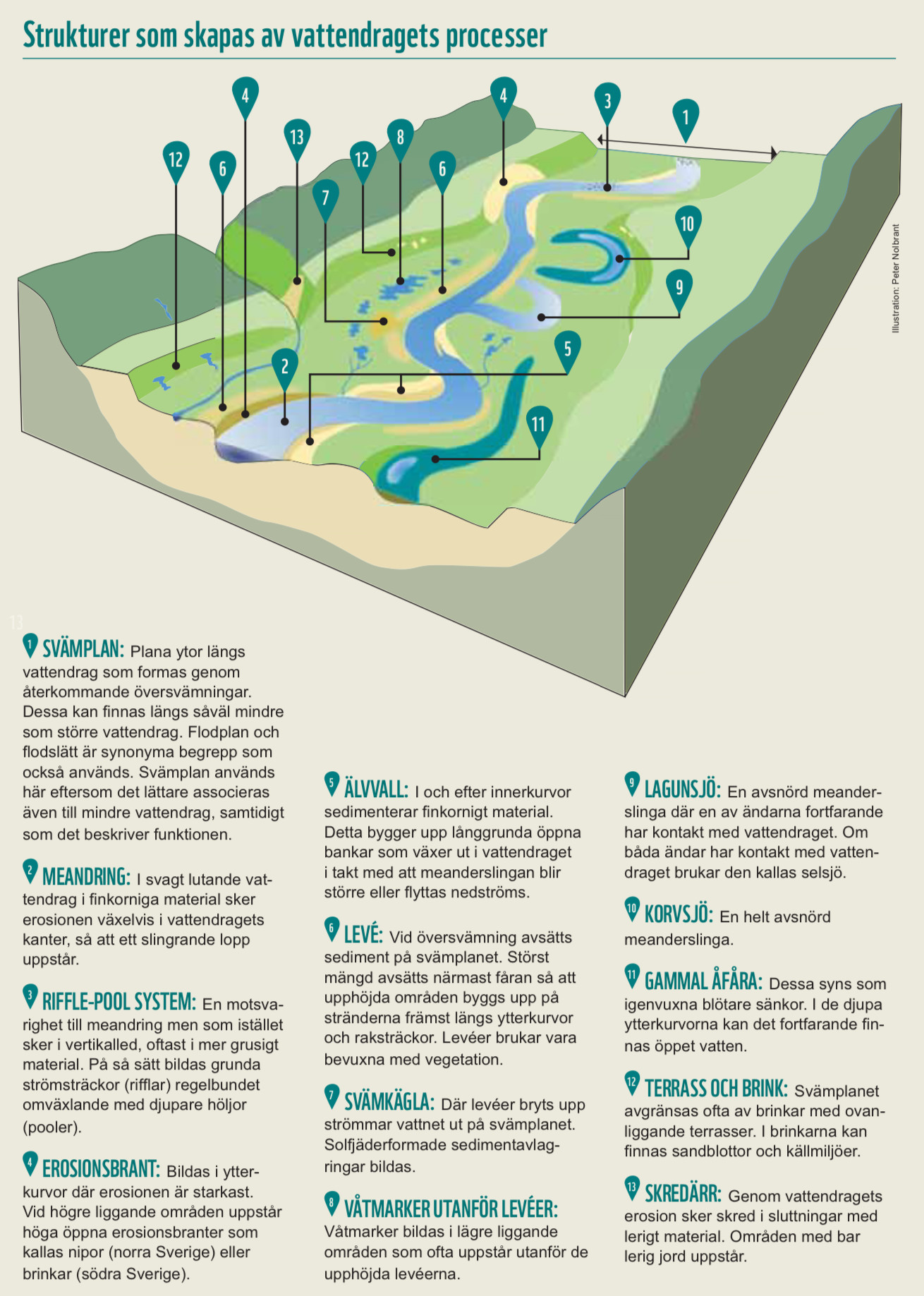 Om vattendraget har möjlighet att meandra, bildas stränder naturligt i och efter ”innerkurvor”. Kanske något att tänka på. Om det finns ett hinder i strömningsriktningen blir det alltså en sedimentering av finkornigt material bakom samma hinder.