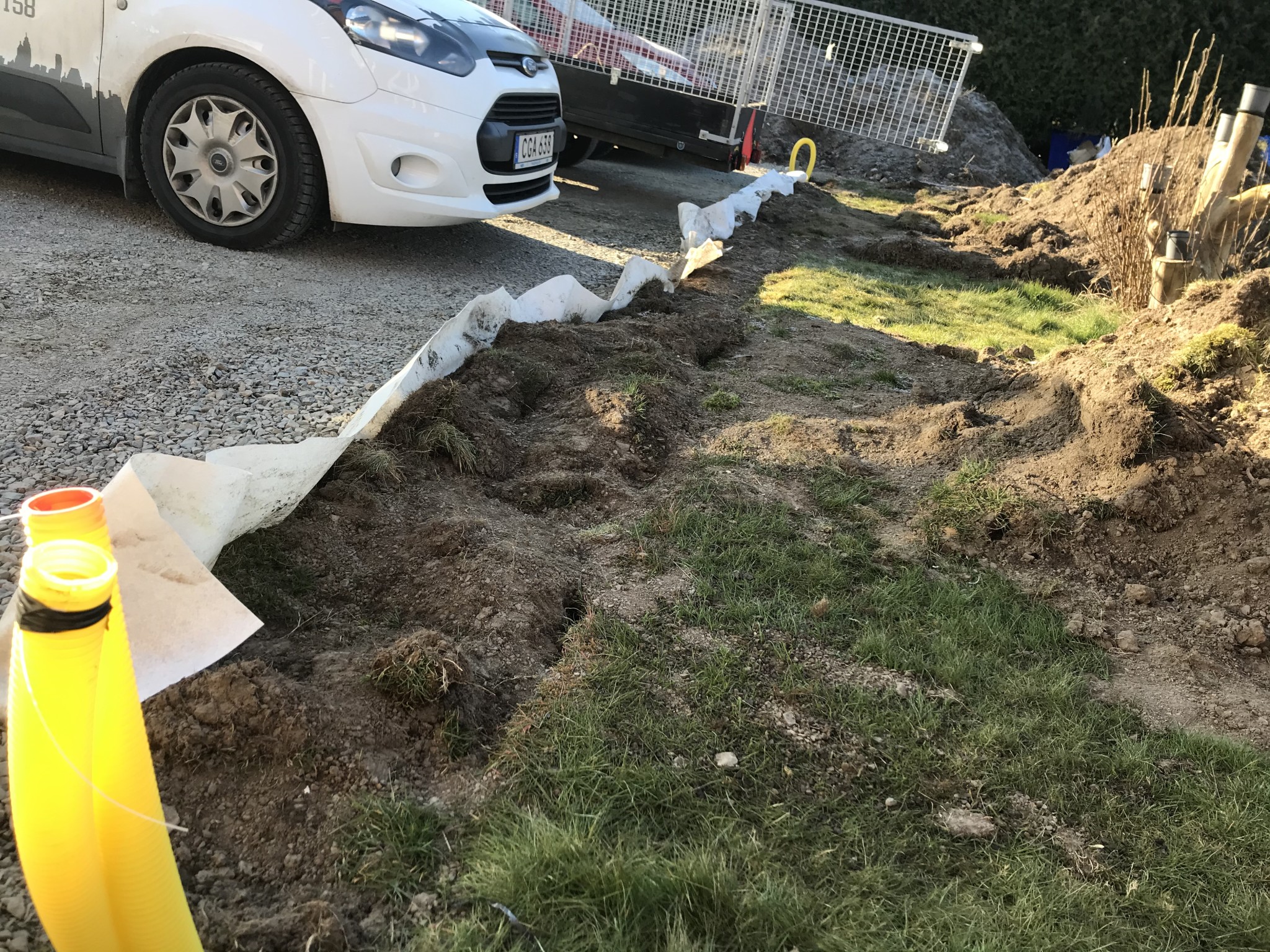 hursomhelst, väl på grävdagen så kom dom med en minigrävare och padda. De skulle gräva och vid lunch skulle lastbil komma och tippa i bärlager. Jag åkte till jobb och min grundtanke hemma med sjukt barn. Vid lunchtid ringde frun och berättade att de var långt från klara. Lastbilen kom vid 13.00, men eftersom de inte beställt en bil som kunde tippa åt sidan (smal gata) hade de bett honom att tippa 60 meter bort och flyttade sedan allt med hjälp av minigrävaren och ett litet bilsläp. Det räckte såklart inte så de hade beställt ytterligare en lastbil med bärlager som gjorde samma sak.