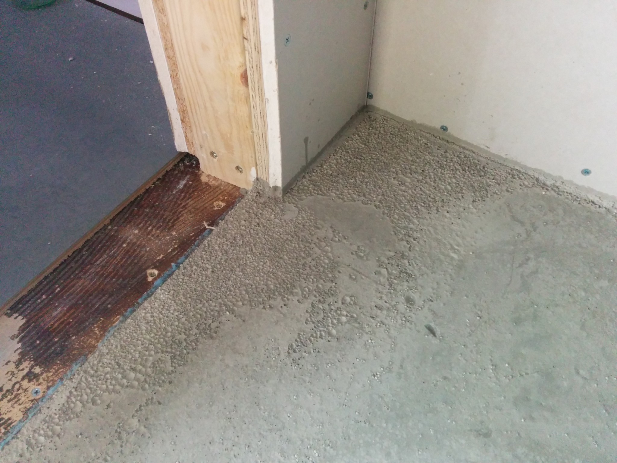 Men som vi kom överrens så skulle firman först gjuta över golvvärmen med en slipsats och sedan flytspackla ovanpå det. Jag har vart bortrest och därför inte kunnat kontrollera processen. Om de sedan frångått det vi kommit överens om så spelar det mig ingen roll, så länge det är rätt och riktigt. Jag tror det är något typ av EPS betong, men ytan känns inte tillräckligt slät för att tätskikta på, och även om den vore slätare så skulle alla luftbubblor eller hål efter frigolitkulorna inte kännas bra att ha under membranet.