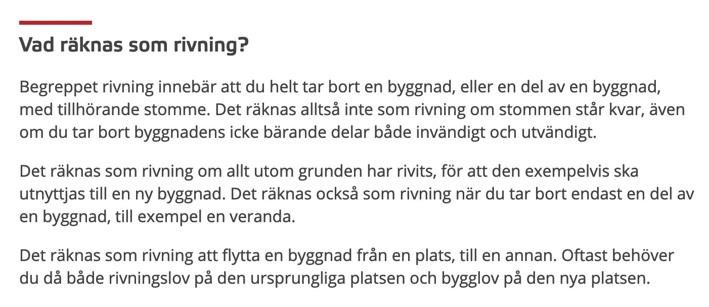 Även om min sympati helt ligger med TS och jag politiskt vill se kraftiga liberaliseringar av bygglagstiftningen så har jag svårigheter att se att detta händelseförlopp inte skulle kräva rivningslov och nytt bygglov. Någonstans går ju gränsen för just hur mycket man kan bortföra innan det anses vara rivning. Boverket sammanfattar:Nötegårdsgubben skrev: