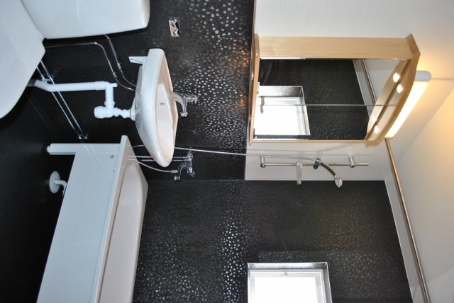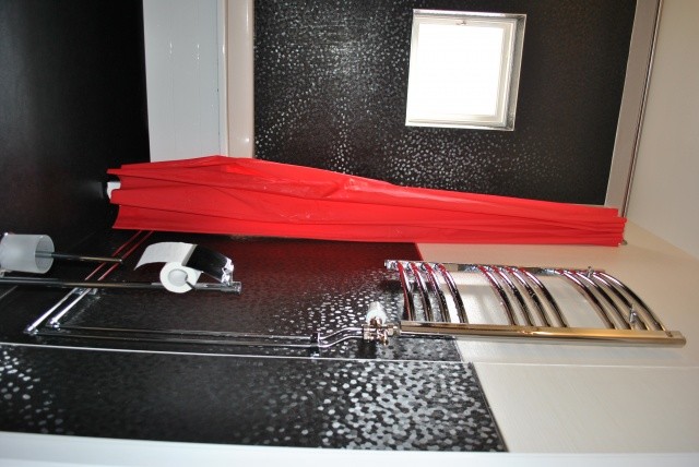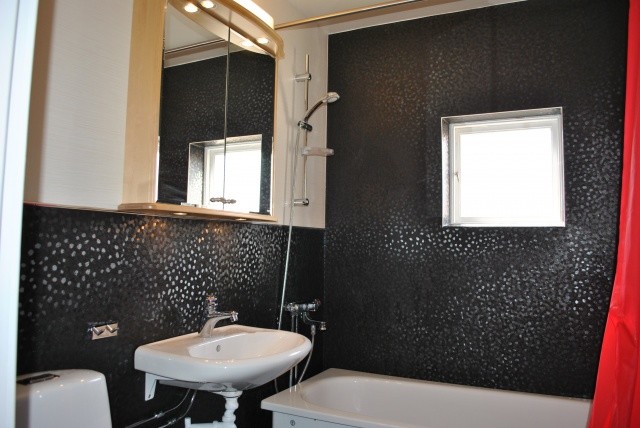 Badrummet i min lägenhet är helplastat men ändå riktigt snyggt. Golvet är svart, och väggarna är svarta med struktur till halvhöjd utom en vägg som är svart till helhöjd. De halvhöjdssvarta väggarna är gräddvita ovanför. En metalllist ligger över skarvningen, som ligger precis under spegelskåpet. Inredning i ljus björk.