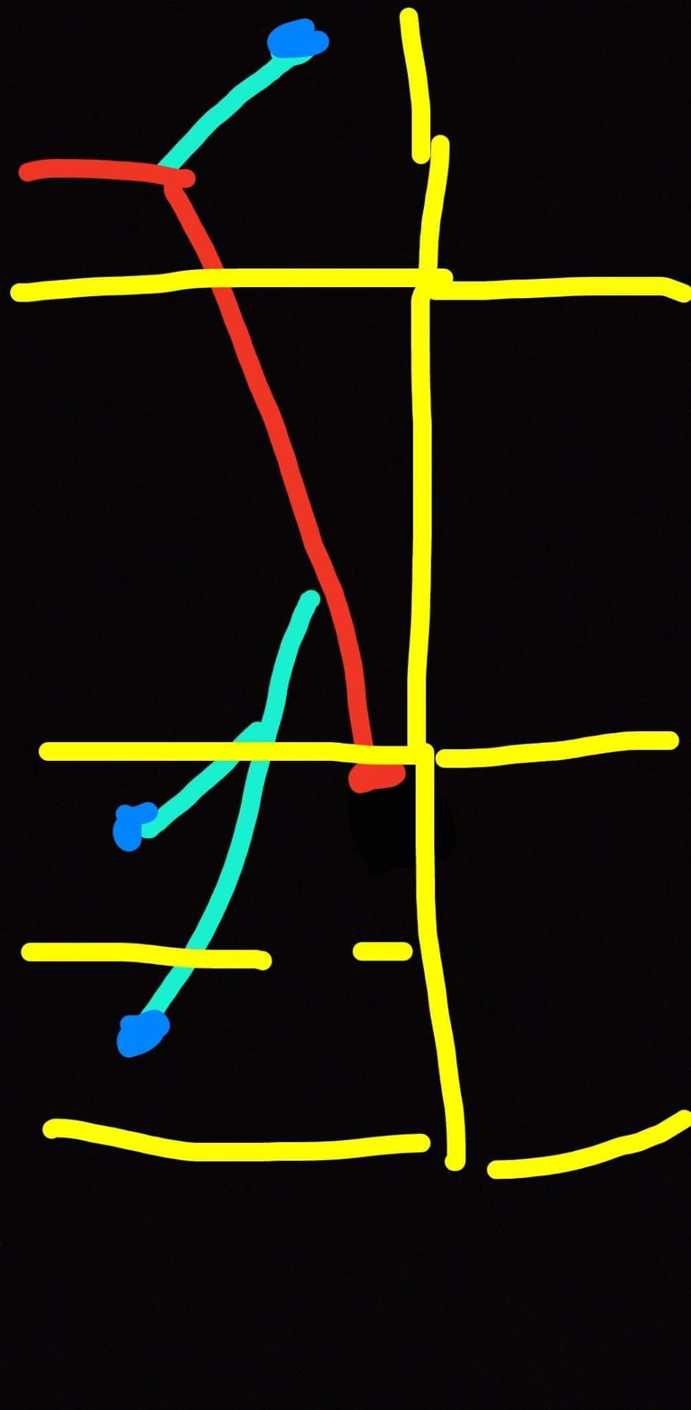 Det gula på bilden är väggar, blå är från golvbrunnar och röd är stam från ovanvåning som går ner i golvet.