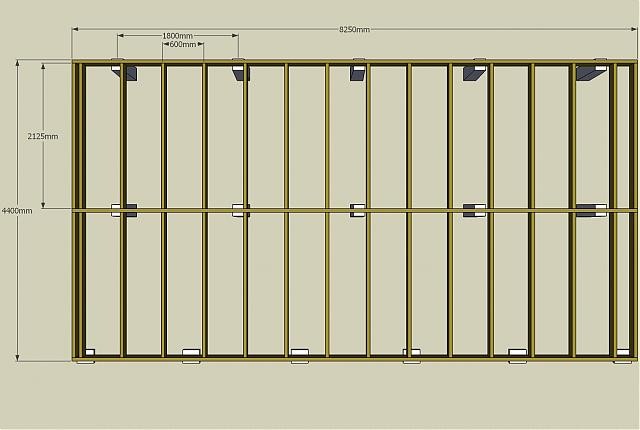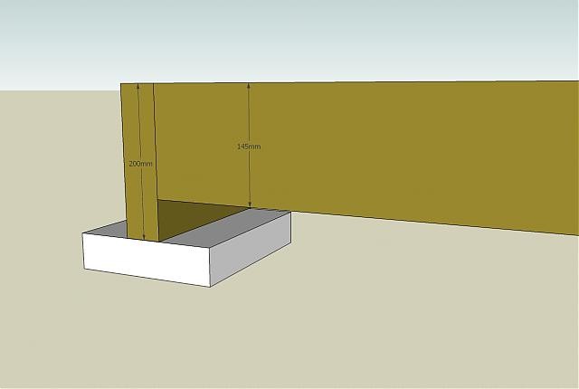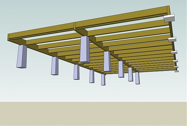 Jag vill inte gärna gräva nära det nybyggda huset, och så bygger det alldeles för högt med bärlinor, golvreglar och trall. Så skissade jag ihop ett förslag som innehåller både plintar och cementplattor närmast väggen.