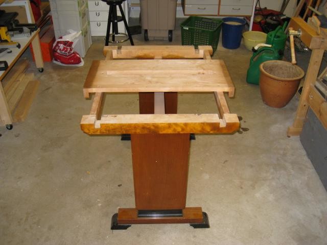 Skivan till Farmors gamla matsalsbord var tyvärr bortom all räddning, skadad som den var av vatten och värme. Eftersom det var tunt faner med shellack så fanns ingen möjlighet att slipa och lacka. Ivajefall inte med en rimlig arbetsinstas som jag såg det. Lite synd eftersom det f.ö. var ett bra bord men lite för smalt för att fungera riktigt bra som matsalsbord. Så småningom togs beslutet att bordet skulle bort. Skivan fick gå hädan men när jag senare skulle försätta underredet i transportabelt skick så insåg jag att det var ju ganska stabilt. Kanske kan man utnyttja det till något annat?