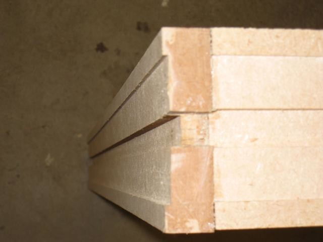 Ramen gjorde jag av några MDF remsor som limmades ihop till "reglar". Tyvärr finns ingen bild på hela ramen men här syns de spår jag fräste ut för att kunna göra någon slags T-spår. Ramen skall kunna hålla en skiva om 200x80 cm. Detta bör bli stort nog för att man skall kunna lägga upp en hel skiva (250x120 cm) som skall delas upp.