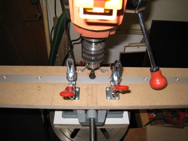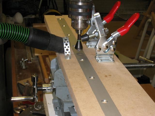 Sedan borrade jag hål i 2x20 mm aluminumprofil. För detta skulle gå lite smidigare så gjorde jag en jigg till pelarborren. Efter att ha provat ett antal försänkare med blandat resultat så hittade jag den som syns på bilden från Festool. Det blev i stort sett bara ett spån per hål och inget klet, den rekommenderas även till Alu. Som synes ordnade jag också med utsug. Jodå, spånen fastnade utmärkt i slangen. :)