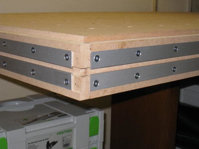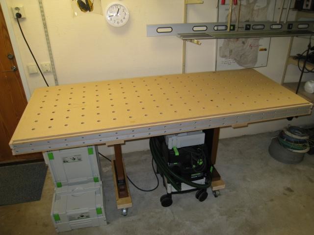 Kanske skall lägga till att jag i övrigt är otroligt nöjd med möjligheterna till fastspänning som alla hålen ger i kombination med "T-spåren" på sidorna. Storleken gör också att det går att lägga upp t.ex. en hel MDF skiva och kapa upp den i mindre bitar för vidare bearbetning i bordssågen. Jag har väl aldrig riktigt saknat att hålen inte är 100% i rät vinkel i förhållande till kanten och varandra.