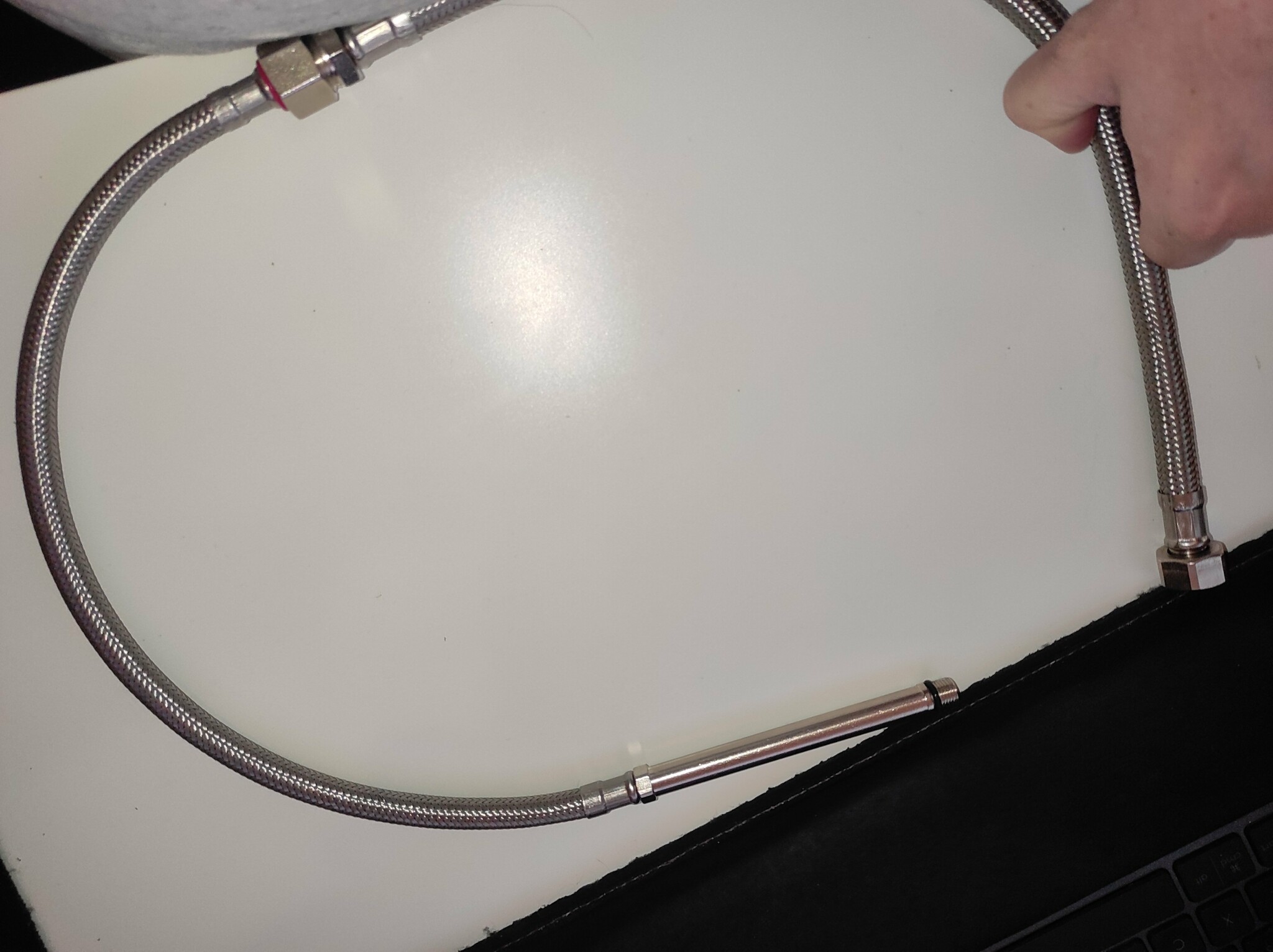För att förlänga har vi köpt anslutningsslang invändig utvändig R10 på rekommendation av hornbach där vi köpte blandaren. (Vill även nämna här är slangen till blandaren är smalare än den nyköpta - om det gör skillnad). Så här ser det ut när man satt på den nya slangen till blandarens: