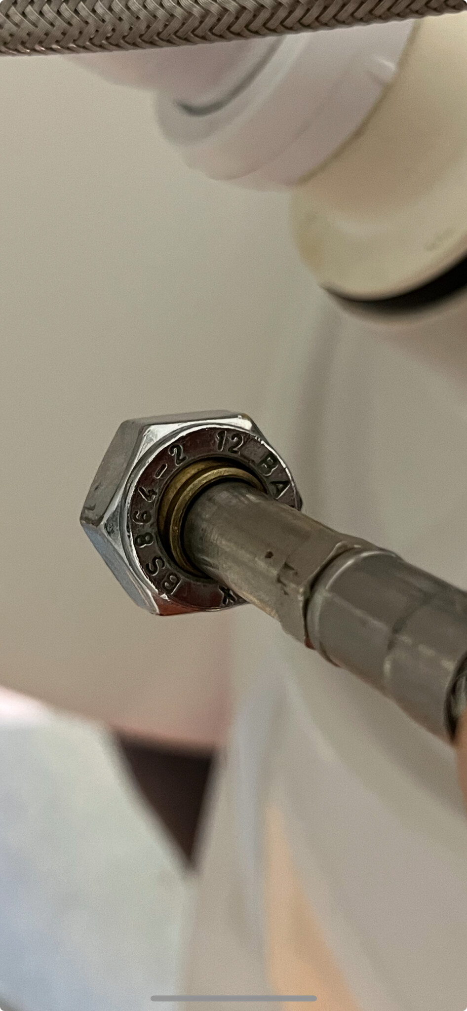 Rören på blandarslangen är 10mm, kulventilerna som sitter ser ut att vara för 8mm rör. Byt kulventilerna. Och ta bort den gamla klämringen/förstoringen på blandarens rör, även muttern, så kan du vara säker på att allt passar bra sen. Rören under ser ut att vara 10mm men mät för säkerhets skull. Köp sen typ: