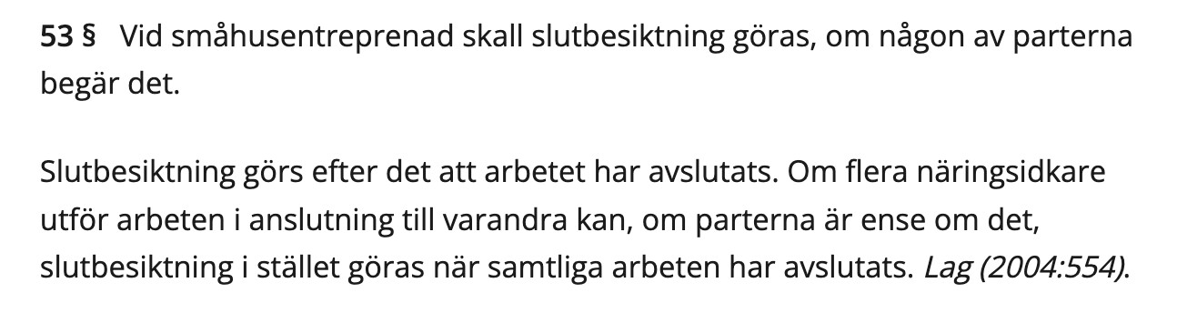 Ansvaret ligger helt på dig som byggherre eftersom du inte har köpt någon byggentreprenadtjänst. Någon slutbesiktning är inte aktuell eftersom något sådant lagrum inte finns i konsumentköplagen. Besiktning sker ju helt civilrättsligt mellan parterna för att avgöra att avtalet mellan köpare och säljare vid byggnation är uppfyllt. Men här saknar du ju en motpart. Och sådan besiktning regleras i konsumenttjänstlagen som ju inte är aktuell här:S Helena mfl skrev: