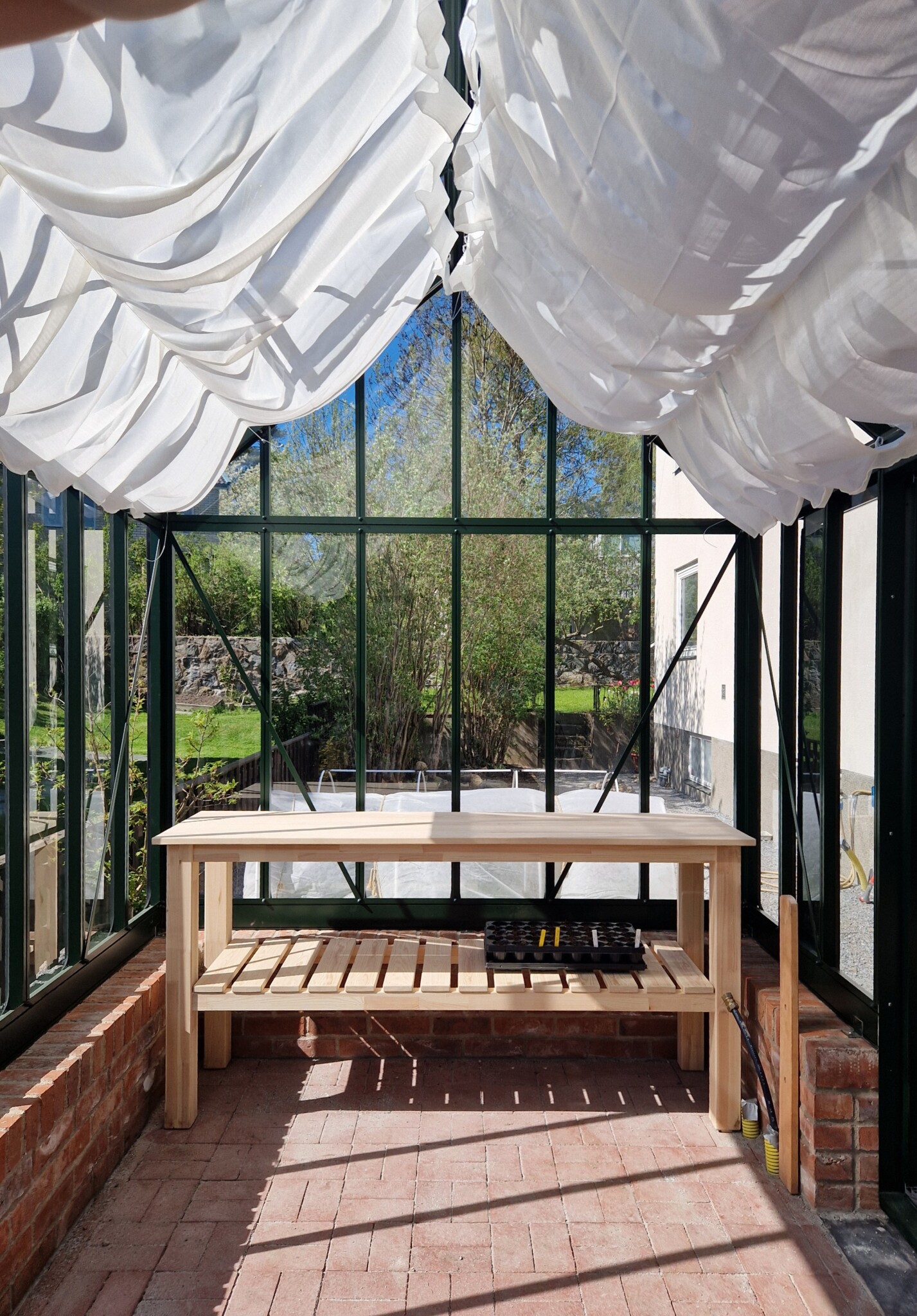 Vi har 3 dubbeluttag (ett på varje vägg - förutom långsidan där dörren sitter) plus ett enkeluttag och kopplingsdosa i nock för ljussslinga och en kristallkrona som aldrig kommer få plats på grund av alla tomater 😂.
