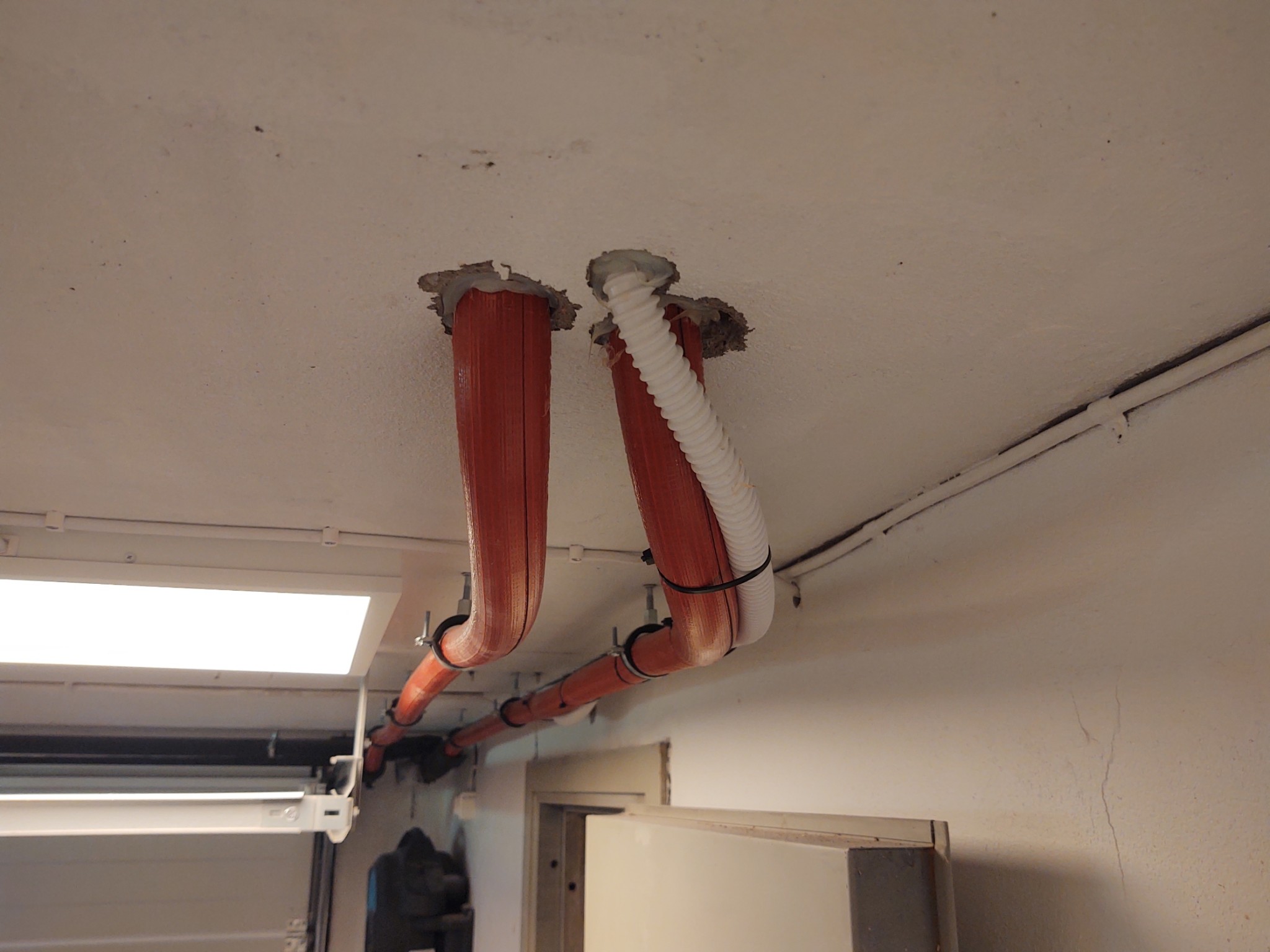 Fläkten är inpackad i isolering på vinden, därefter ligger det ett golv över. den vita slangen är för kondensvatten. de svarta isolerade slangarna på vänster sida är Brinen från BVP.