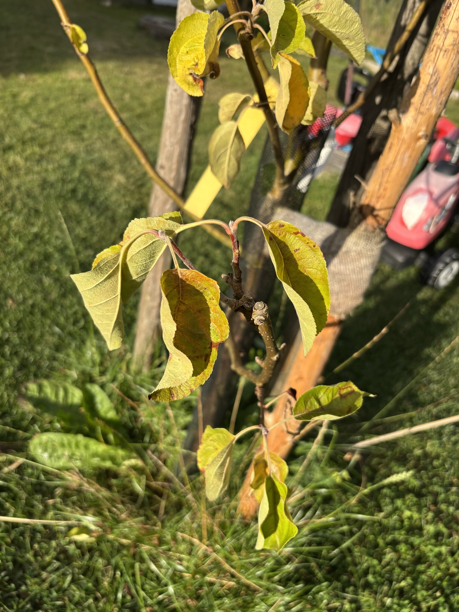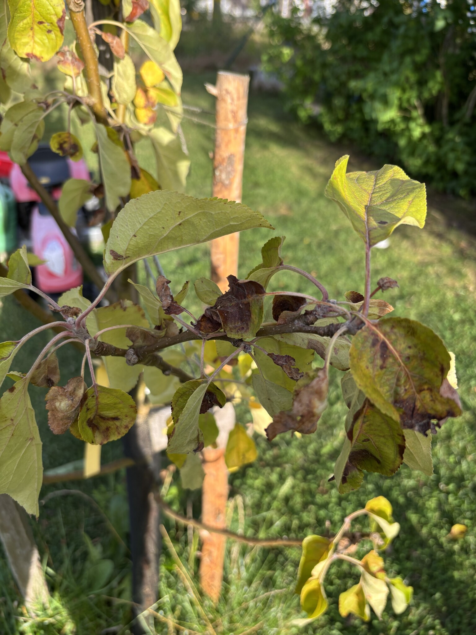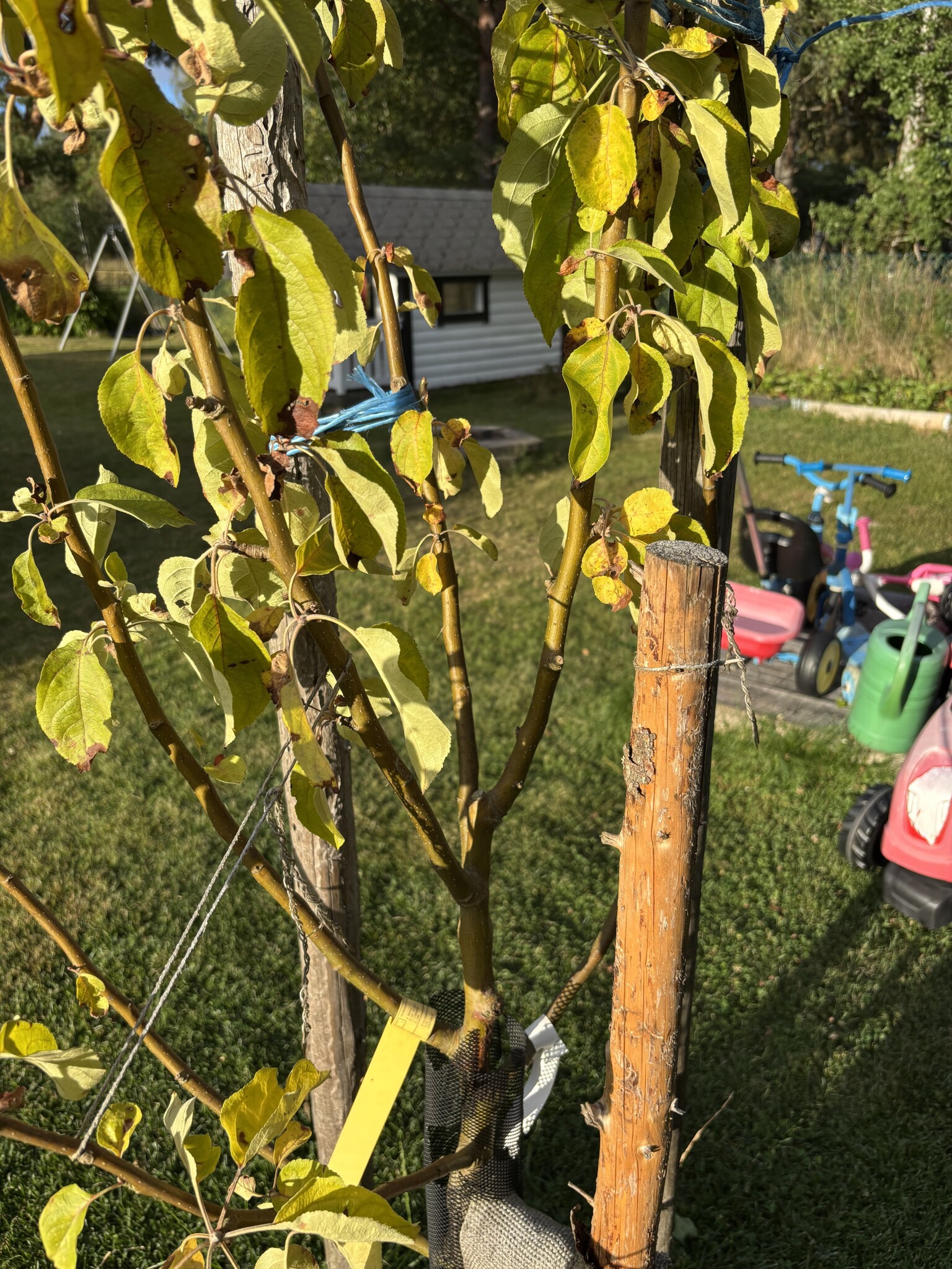Mitt två år gamla äppelträd har på de senaste dagarna börjat sloka och fått gula/brunbrända blad. Trädet står stabilt så ingen sork har varit på det. Har någon idé om vad det kan vara och vad som behöver göras?