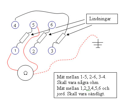 2. Du har 6st "skruvar". Till dessa är 3 lindningar kopplade. Det skall vara några ohm mellan