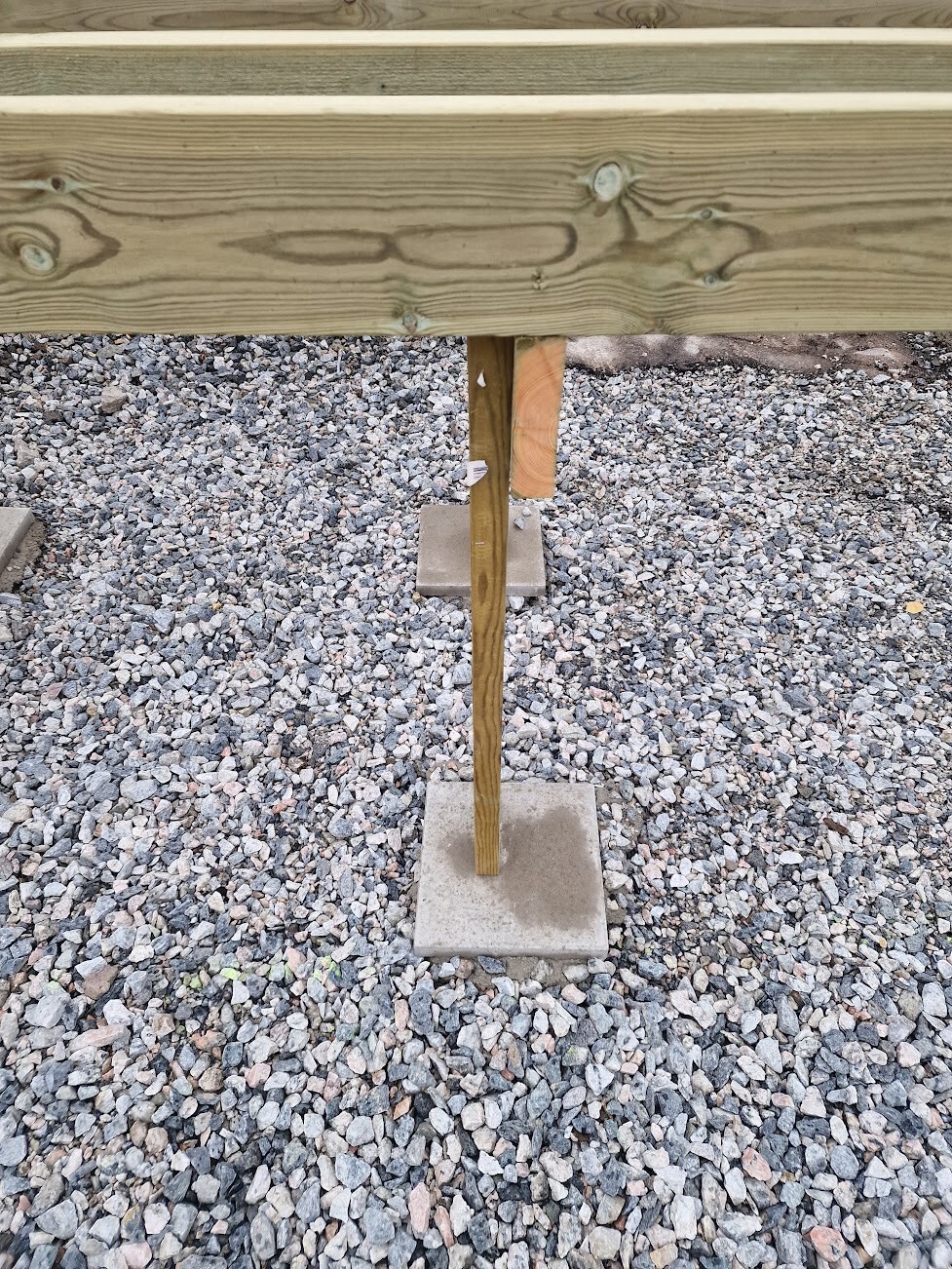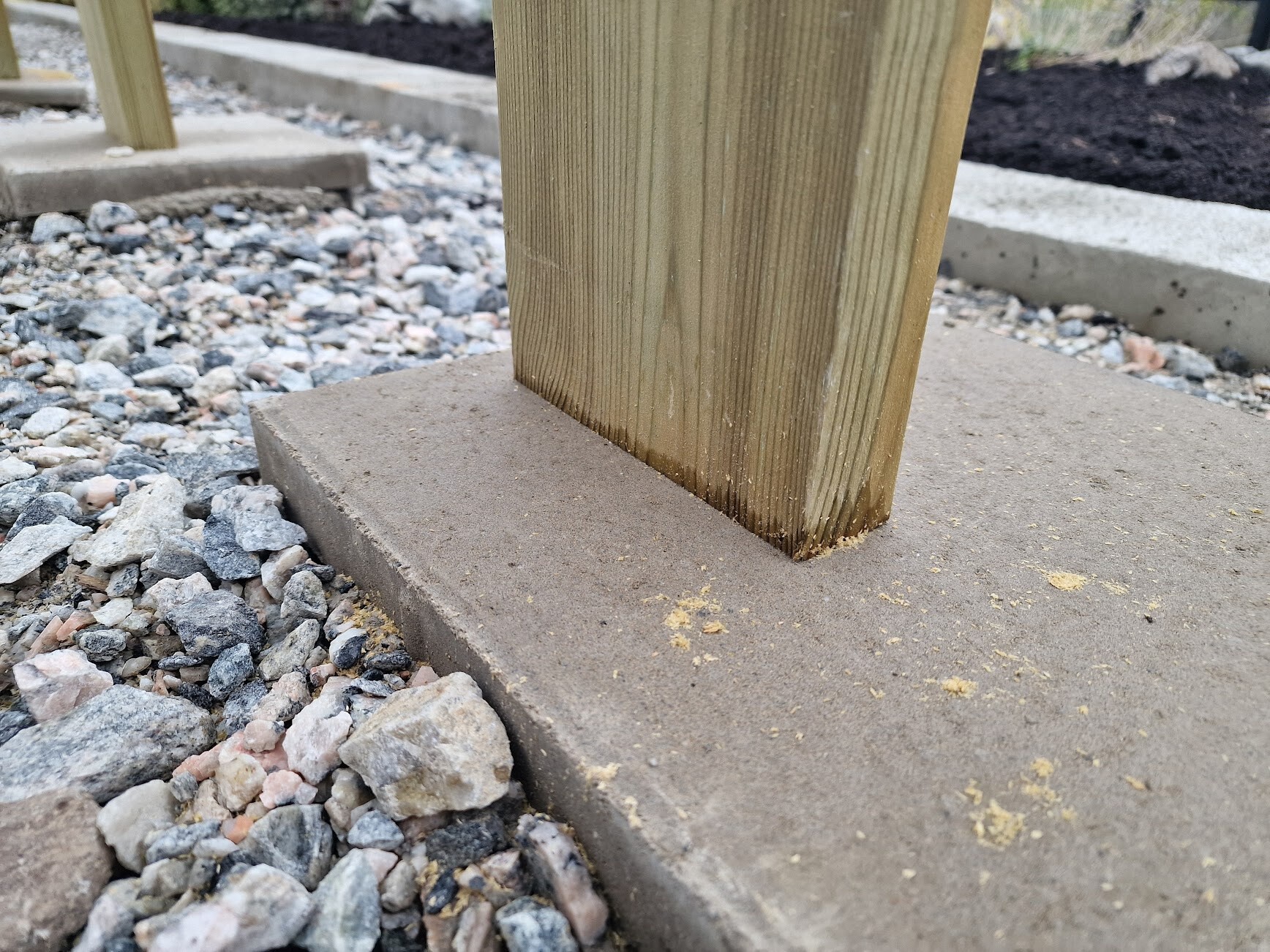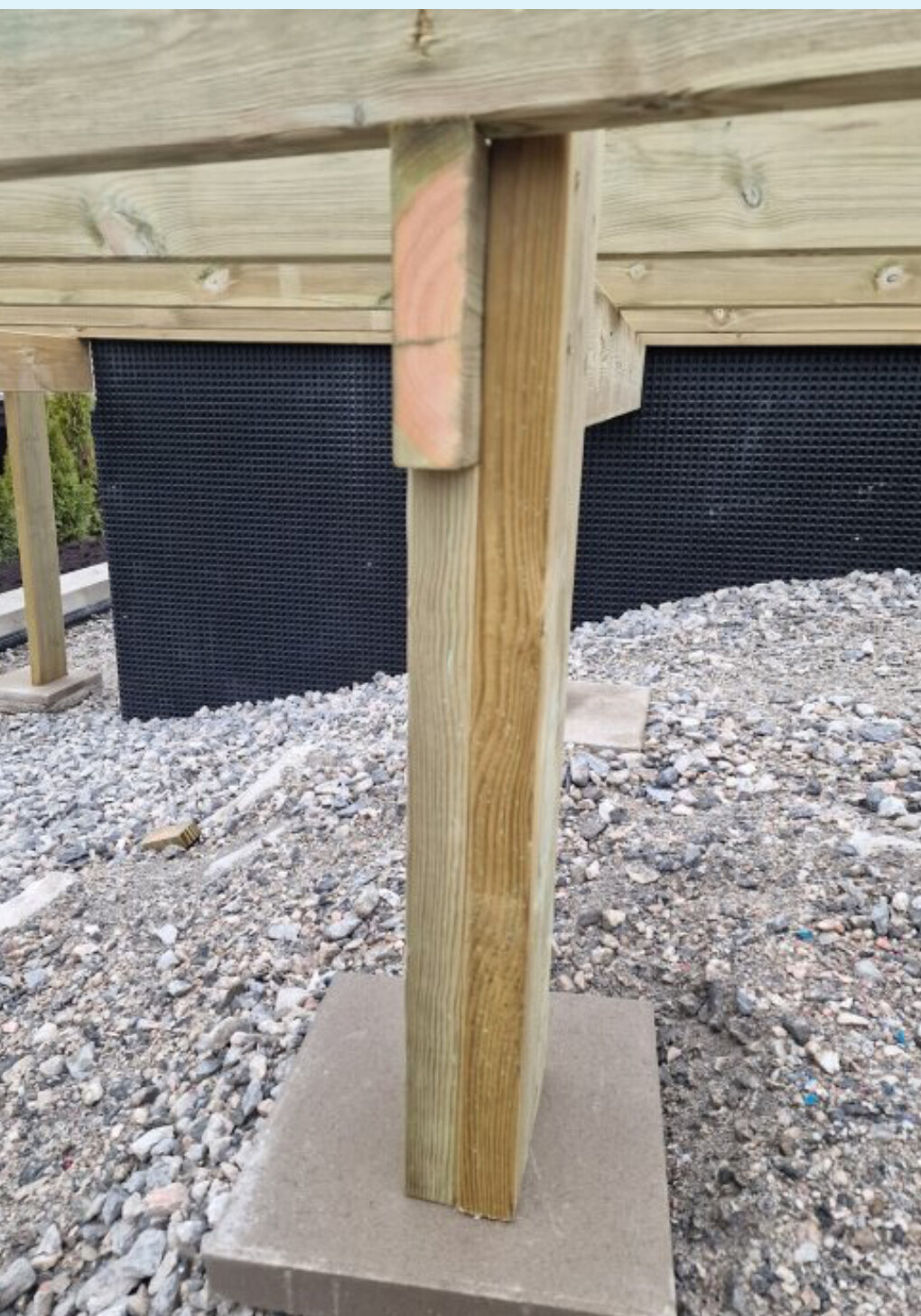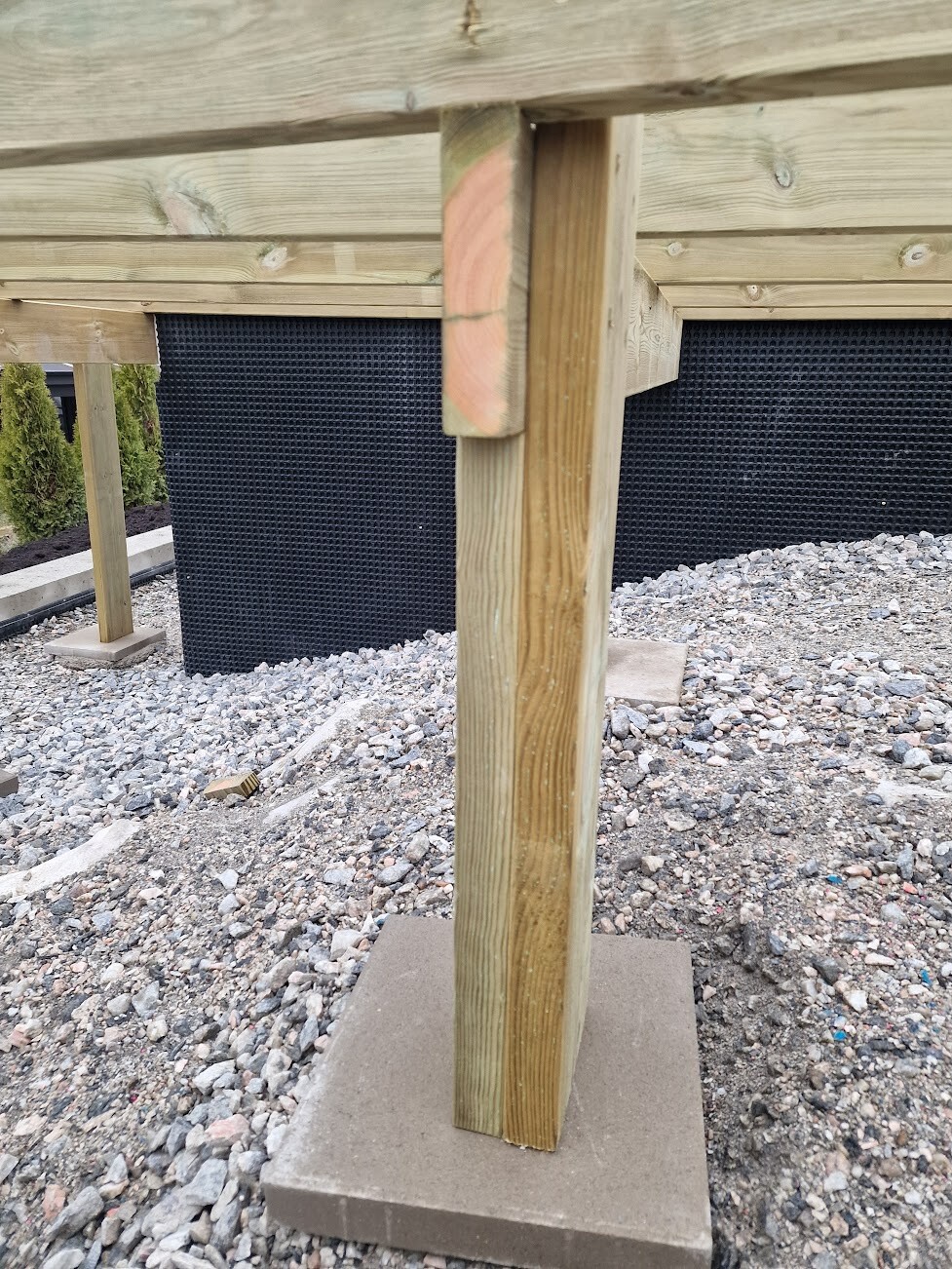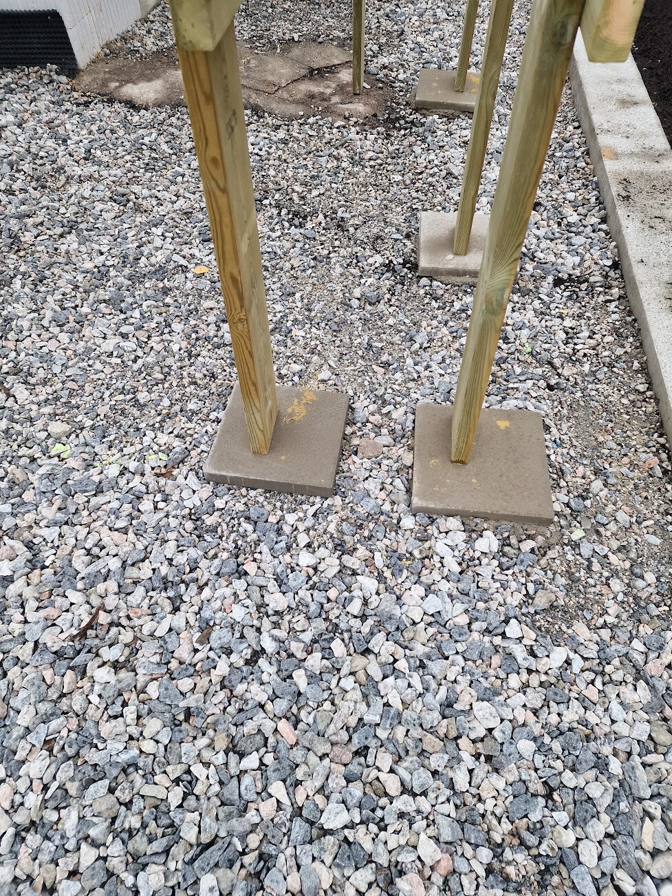 3. Jag hade förväntat mig grundisoleringspapp mellan betongplattor och stolpar. Jag förstår att denna typ av tryckimpregnering mer eller mindre än gjorda för markkontakt och tål mycket väta över många år. Men detta borde väl ändå påverka livslängden för stolparna signifikant? Jag tycker man kan se att fukt vandra från plattan upp i regeln (se bild 5)