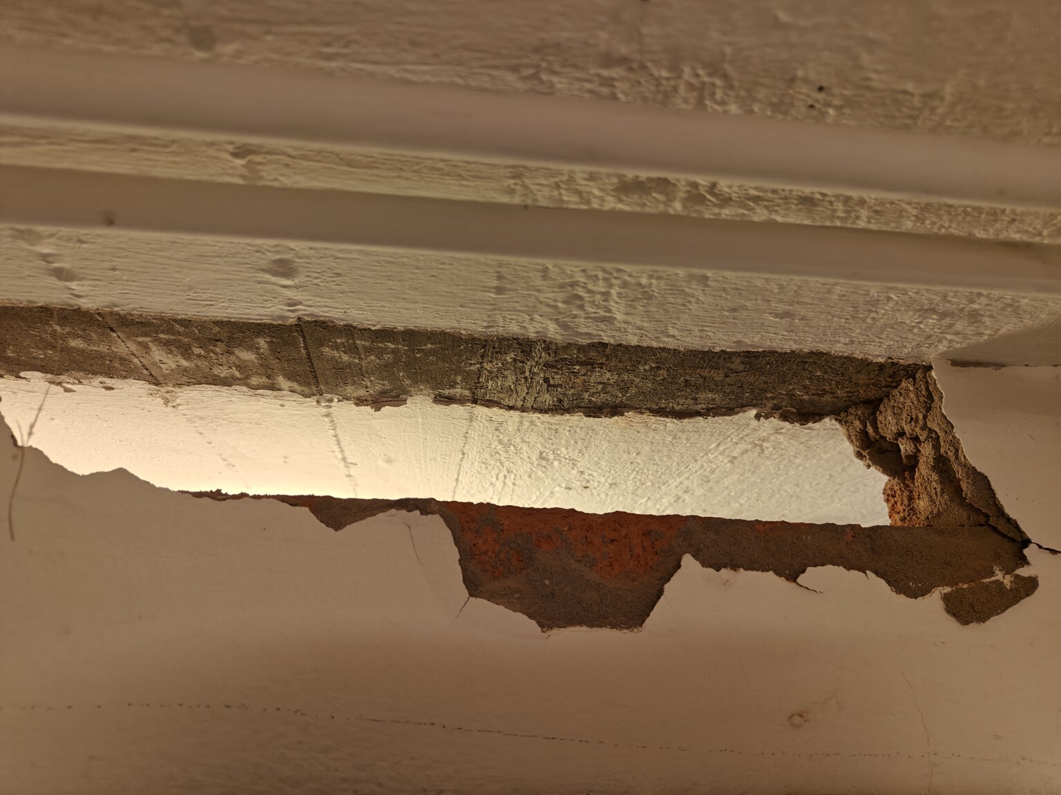 Den sitter ej fast i tak eller golv (ej ingjuten) utan vid de två provhål jag slagit upp så ser man tydligt gjutningsspåren från taket (som måste ha gjutits innan väggen byggdes?).