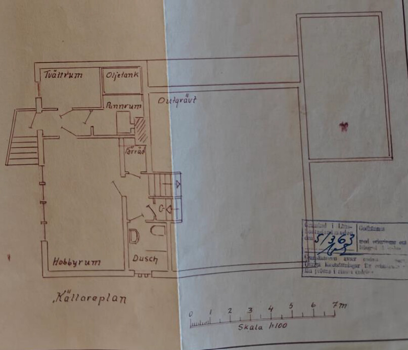 Jag har även 3 olika versioner av originalritningarna, där som både beskriver hur väggen jag nu vill ta bort inte finns alls, hur det är en extravägg i mitten och flera smårum, samt där det är en dörröppning mellan matkällare/pannrum (på den sista ritningen fanns dock inte den öppna spisen med, så förmodar att murstocken går där bakom idag)...