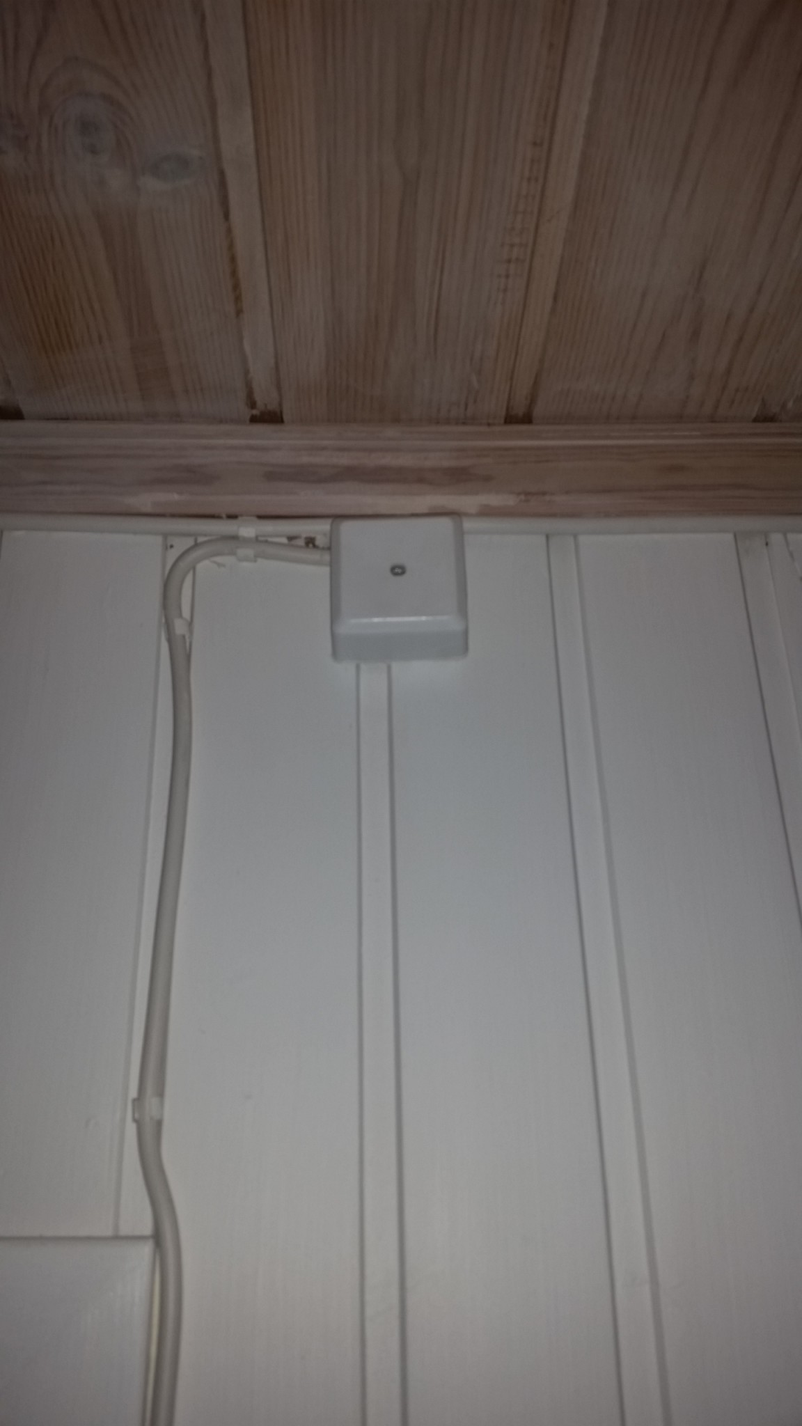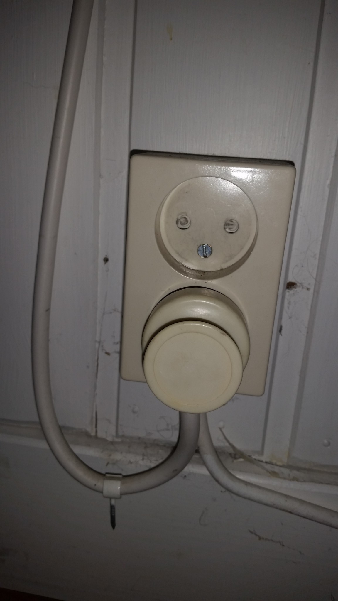 220 hanen sitter inkopplad i vägguttaget(som synes ej jordat), går sedan upp till en kopplingsdosa, därifrån rakt genom väggen och ner till lampan.