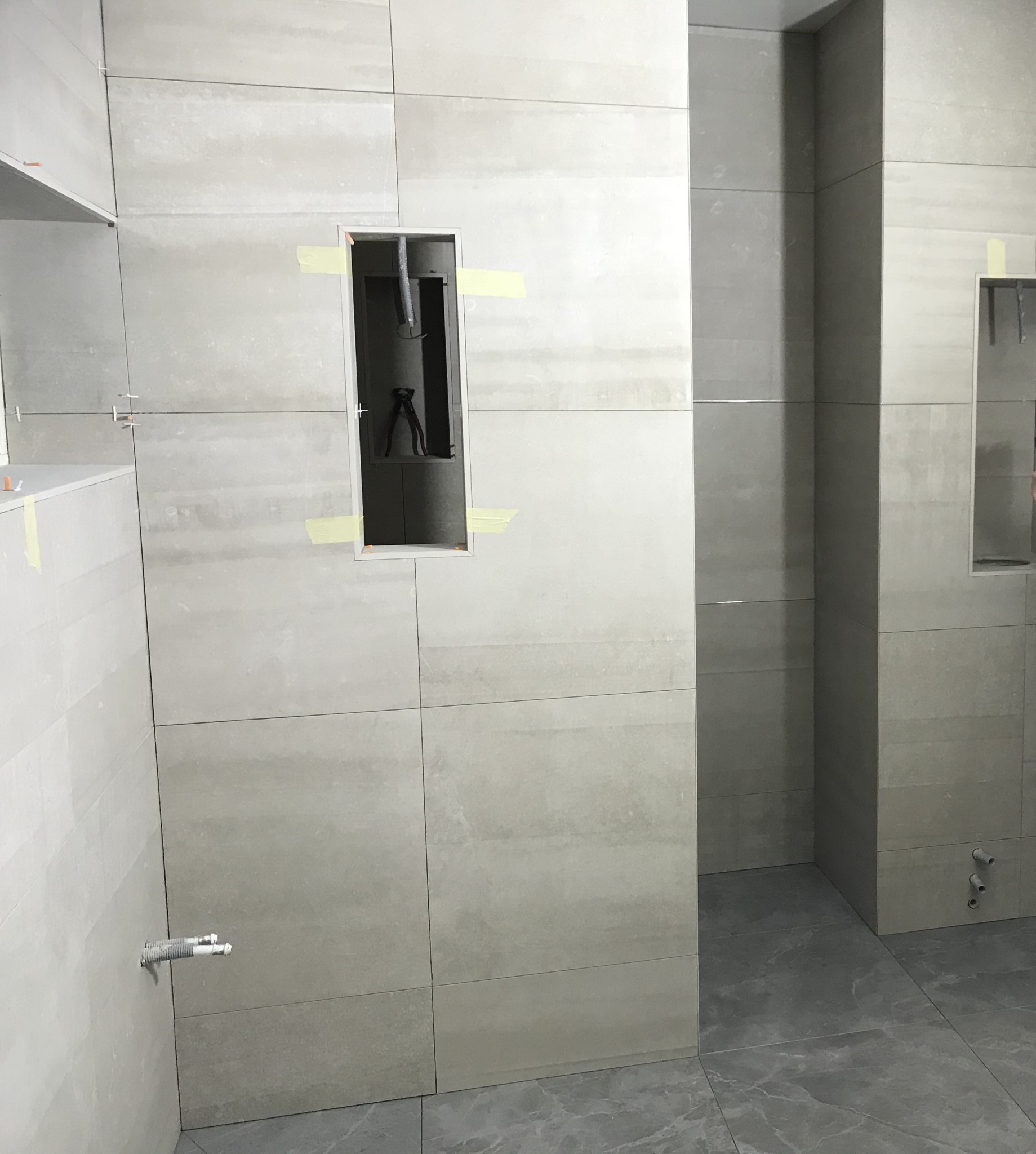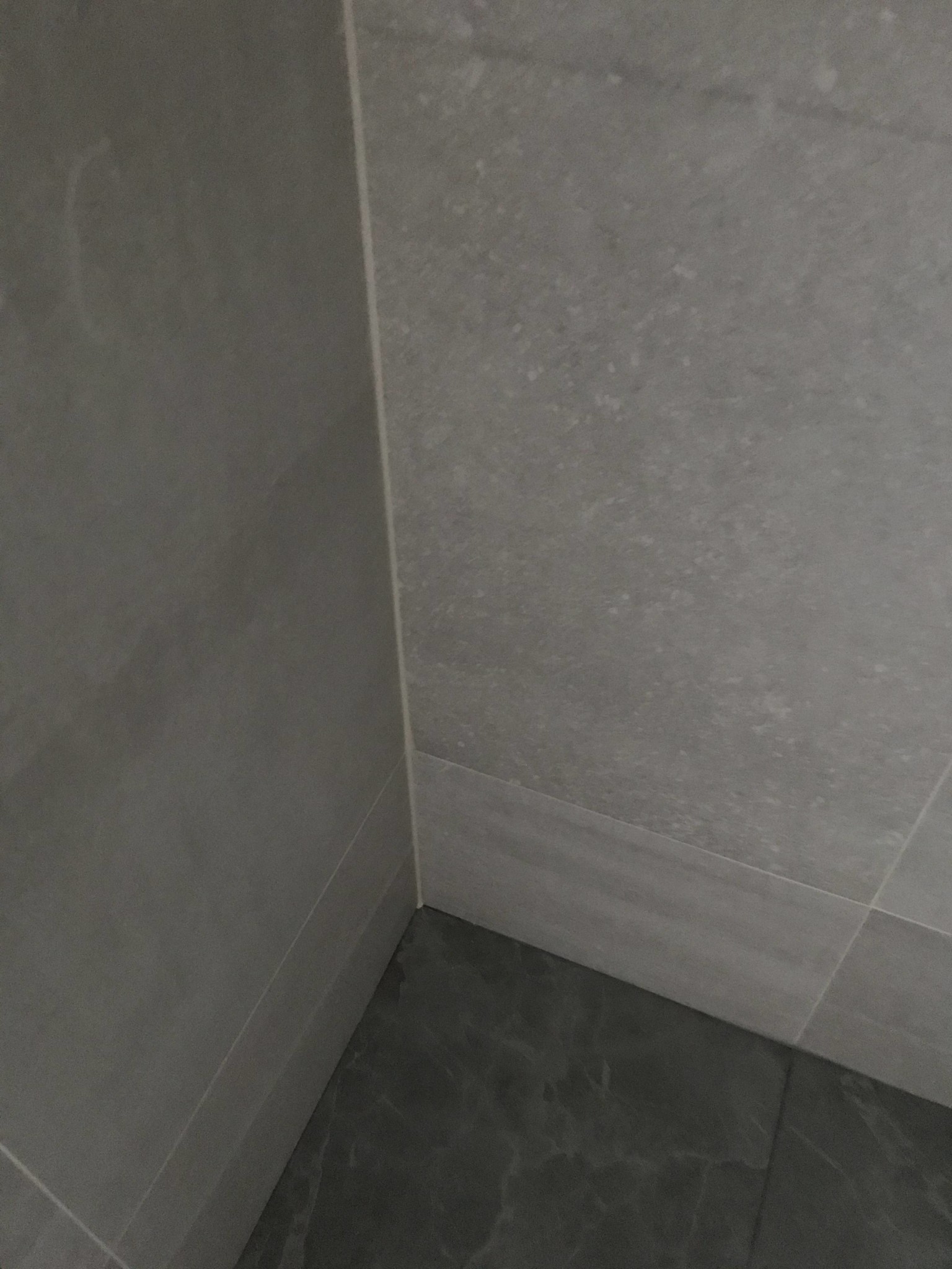 Plattsättaren har satt upp en platta i ett för där en flisa gått ur och lämnar upp till 5mm glipa. Förövrigt väldigt snyggt gjort med 60x60 plattor och 1mm fog. Han menar att det inte kommer synas efter att man har fogat och silikonat hörnet.