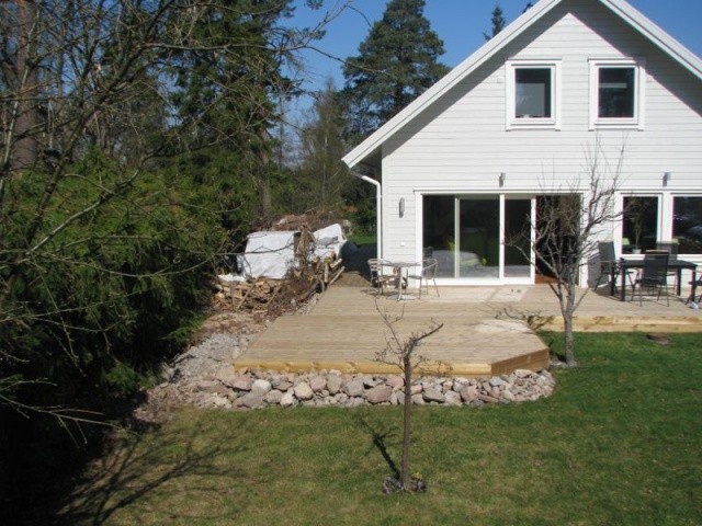 Dock hade vi för plan att bygga ett trädeck på marken, där en del av trädecket skulle hamna ca 2 meter från tomtgränsen. Pga ovan nämnda granne så ville jag såklart först kolla upp att detta var tillåtet. Jag kollade runt på forum, lagtexter och på kommunens hemsida och kom fram till att det normalt sett var tillåtet att bygga trädeck upp till 0,5 meter i höjd ända fram till tomtgränsen. På kommunens hemsida fanns ingen specifik info om trädeck men dock fanns info om att markuppfyllnad fick göras upp till 0,5 meter i höjd och fram till 2 meter från tomtgräns. Därav kände jag mig säker på att bygget var ok, så länge som jag höll mig 2 meter från tomtgränsen. Bygget började. Telefonsamtalet kom. Grannen hade såklart varit mätt avståndet och kommit fram till att det var närmare än 4,5 meter från gränsen och hade anmält oss till kommunen. Så det vara bara till att riva, påstod grannen... Då ringde jag upp kommunen och fick beskedet att det mycket riktigt var som jag hade antagit, 2 meter som gällde. Men de tyckte att pga vår granne så var det lika bra att vi skickade in en måttsatt ritning på trädecket så att de kunde titta på det och vi kunde få skriftligt på att det var ok. Det gjorde jag och fter ett tag hörde kommunen av sig igen och sa att det där behöver man absolut inget bygglov på, be grannen ringa oss om denne har funderingar. Jag meddelade grannen vad kommunen hade sagt och vi färdigställde trädecket.