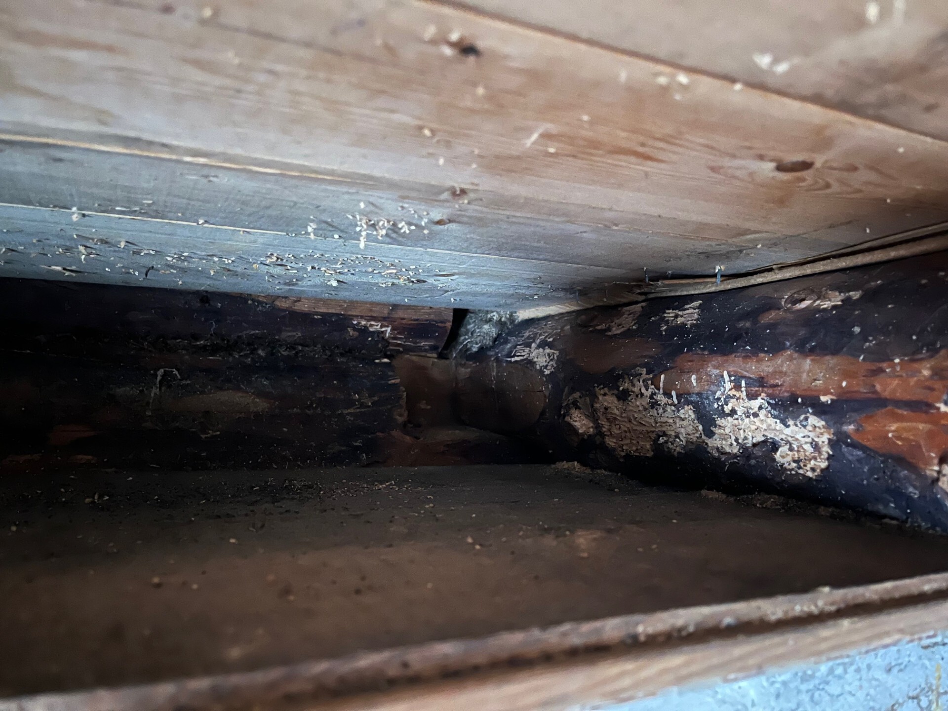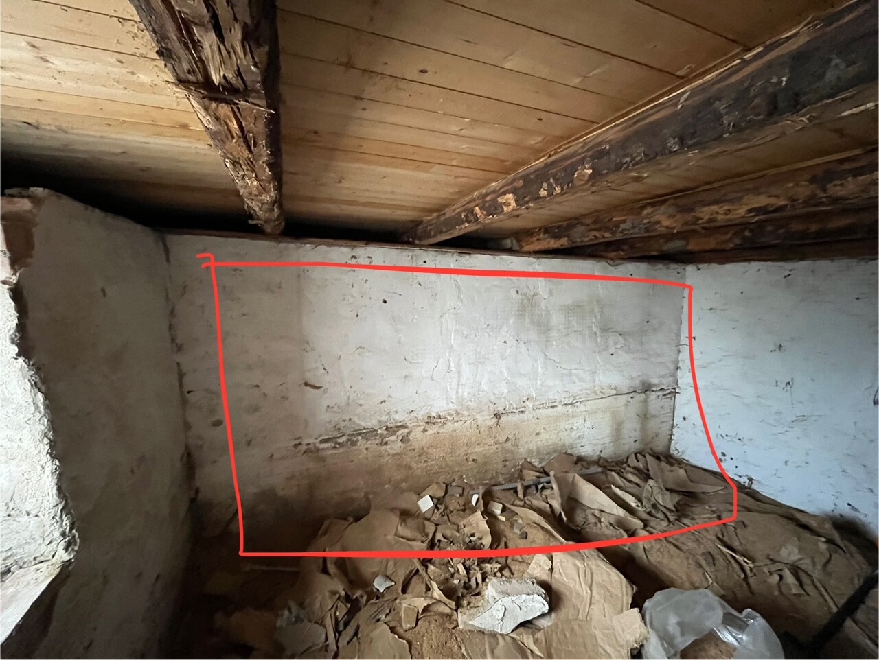 Under tider jag river märker jag att den faktiska ytterväggen, i lecablock, är dold av luftspalt och sedan murad vägg. En av väggarna behöver jag hjälp med att utreda om den kan vara bärande eller bara "hängsle och livrem". Den väggen är inramad med röd ruta. Bifogade bilder visar stockarna som bär undervåningen. Dessa vilar på ytterväggens stockar och sedan tvärgående stockar i mitten av huset. Vad tror ni - kan man knacka ner väggen för att se så att det är okej bakom innan man börjar bygga igen allt?