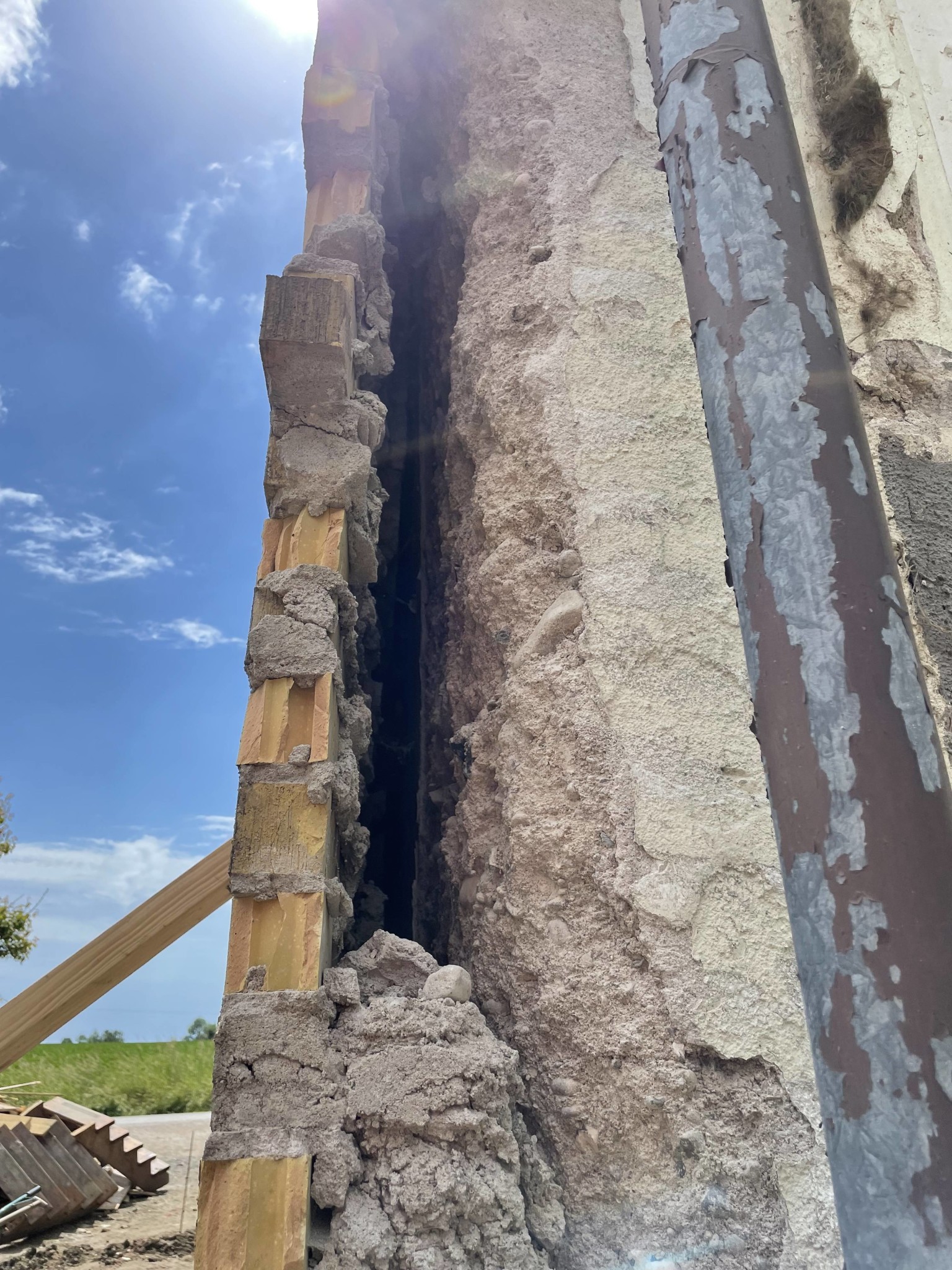 Väggen består av någon gamal sten-cement, lite oklart men bifogar en bild på det och är runt 400mm tjockt. Det gula fasadteglet har åkt ner så behöver inte tänka på det.