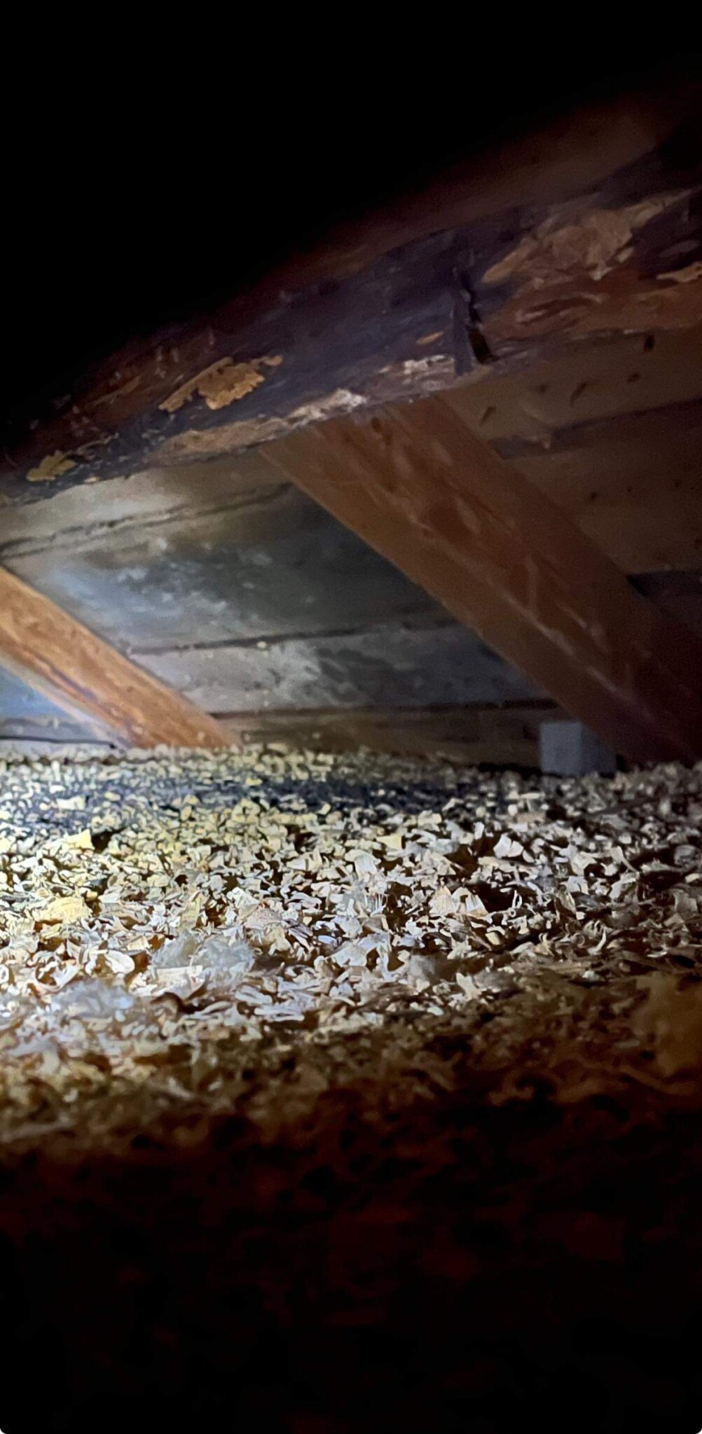 Men det är mörkt i sågspånet också, jag kan inte ta mig in där för det är en halv meter sågspån, och jag har ingen aning hur underlaget är. Jag har bara en inspektionslucka inifrån huset att titta upp på vinden