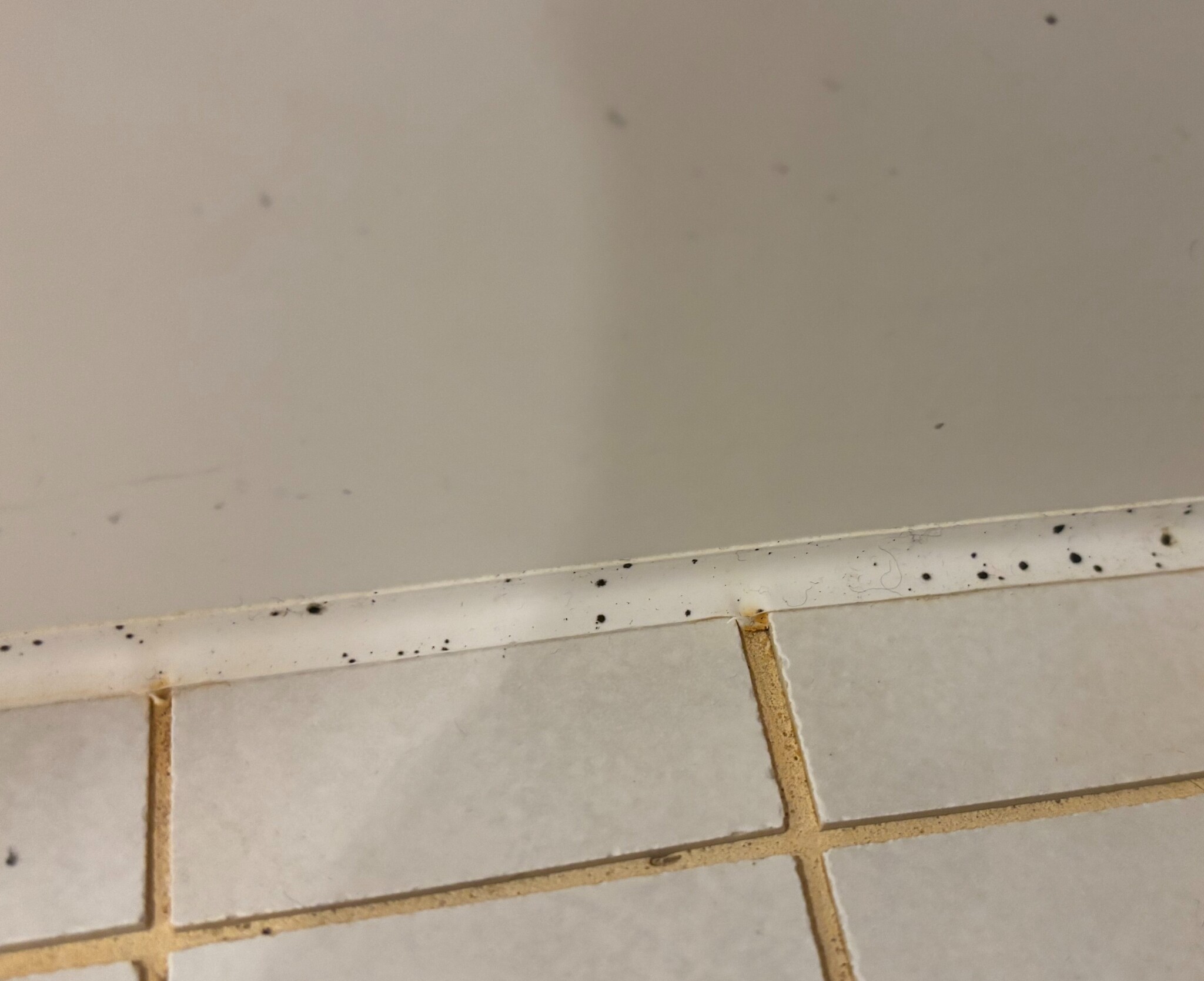 Tror inte att tidigare ägare har använt dåligt / gammalt / felaktigt silikon då denne var byggare och man kan se på första bilden att fogen är riktigt snyggt utförd med knivskarp tejpkant och jämn tjocklek. Detta till trots har de svarta prickarna uppstått under bara ett par år.