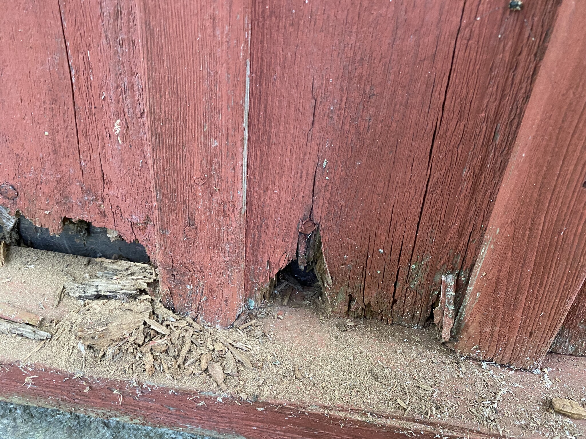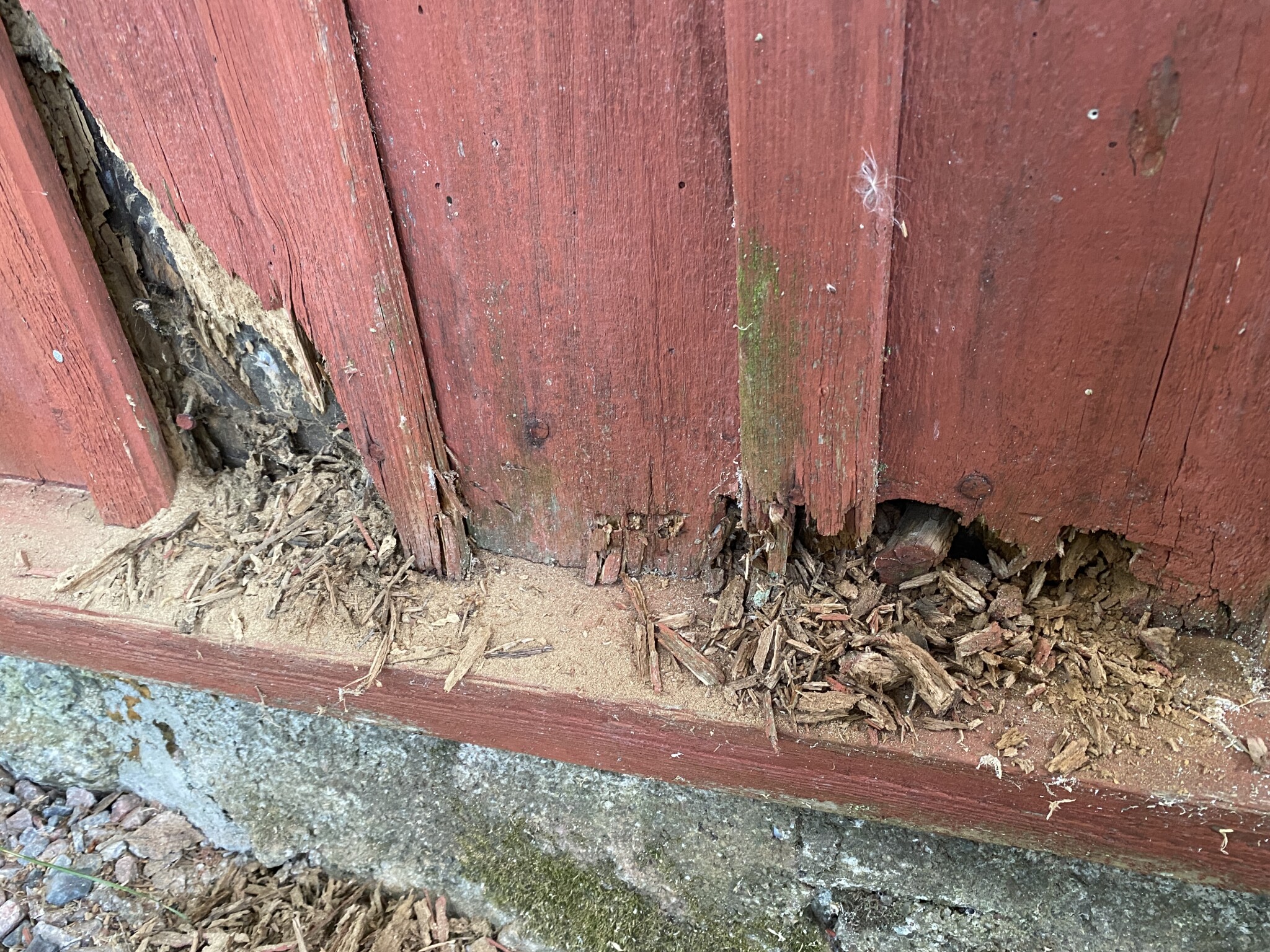 Det fanns millimeterstora ingångshål i brädorna. Innanför ytterpanelen var träet förvandlat till mjöl. Det verkade inte fuktskadat där utan omvandlat till pulver. Andra delar av träet i närheten föll sönder i bitar.