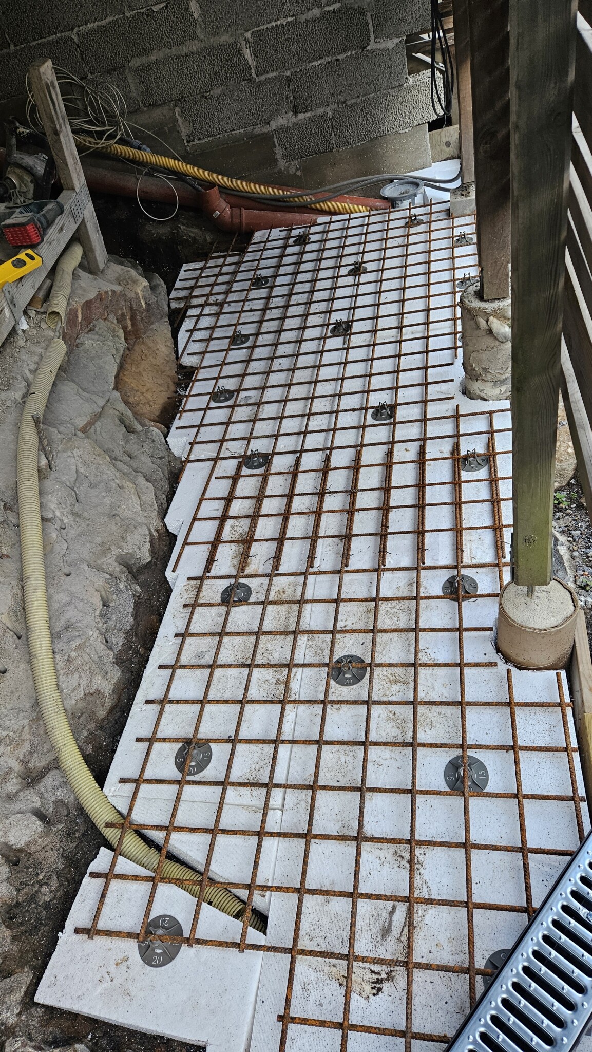 Så här blev det. 100 mm isolering under armeringen. Jag beräknar tjockleken av betongen bli ca 50-60 mm.M Maxitupla skrev: