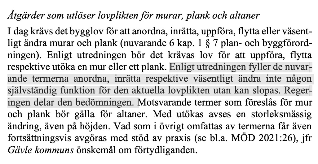 Vad gäller ändringen av PBL så är väl frågan vad regeringen menar med att stryka kravet på bygglov för väsentlig ändring av mur. Både regeringen och utredningen är vaga och redovisar bara att man stryker vissa åtgärdstermer (bl a väsentligt ändra) som inte fyller någon självständig funktion. De nya åtgärderna som triggar bygglovskrav är: "uppföra, flytta eller utöka en mur".