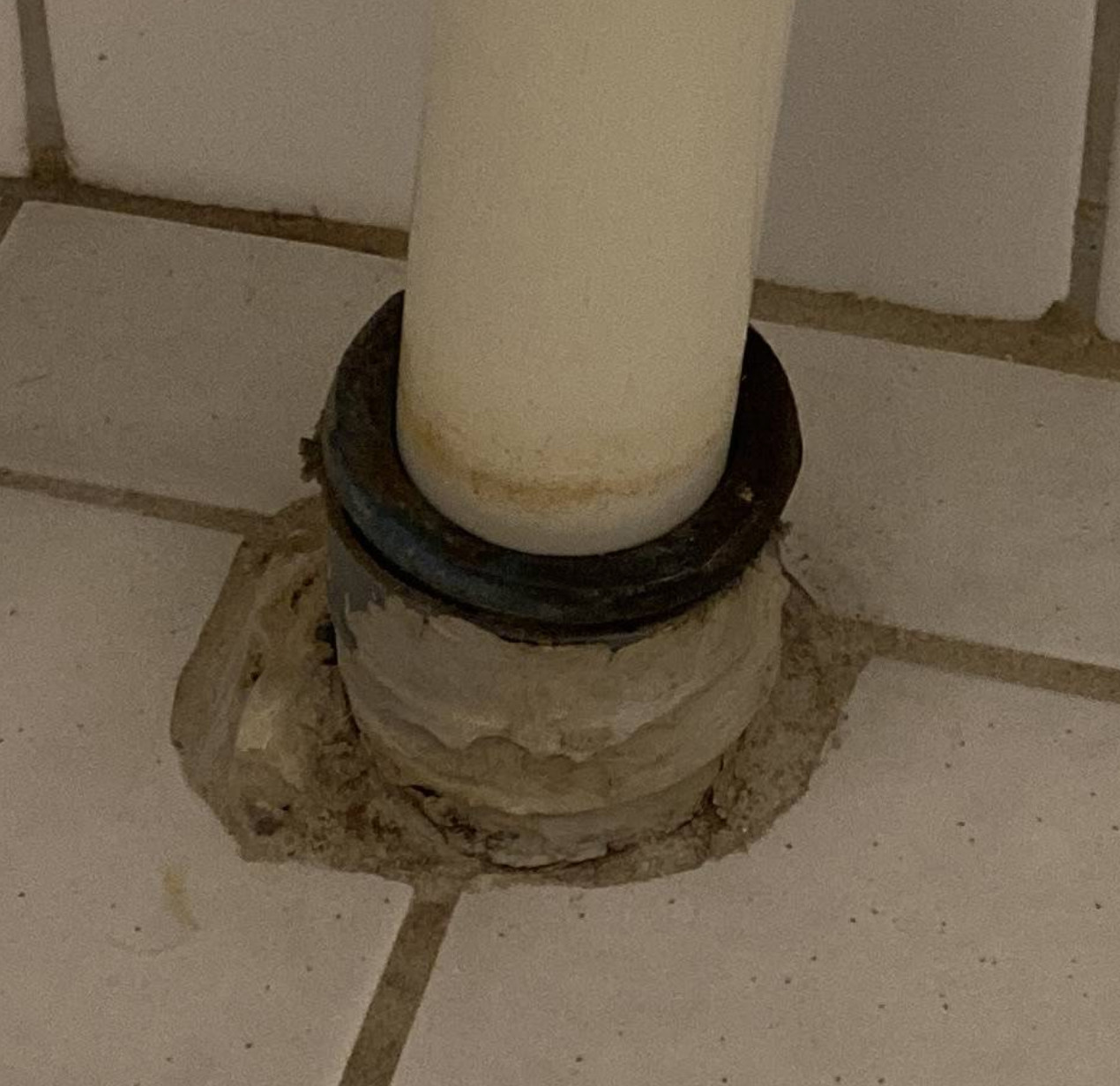 Det ska sitta en manschett inkletad i tätskiktsguck (det grå gegget) en bit upp på röret, det ser det ju ut som att det också gör: